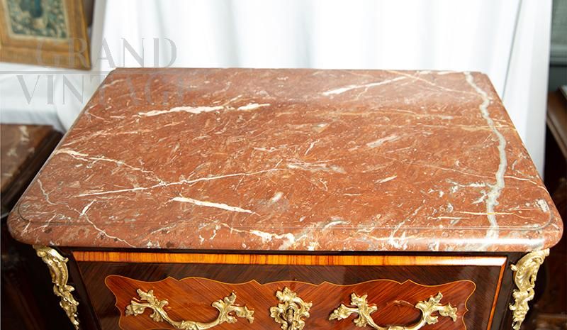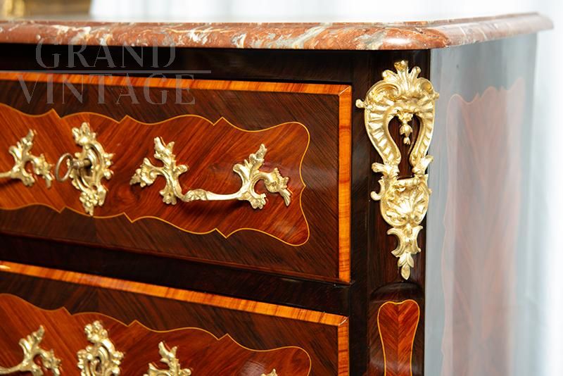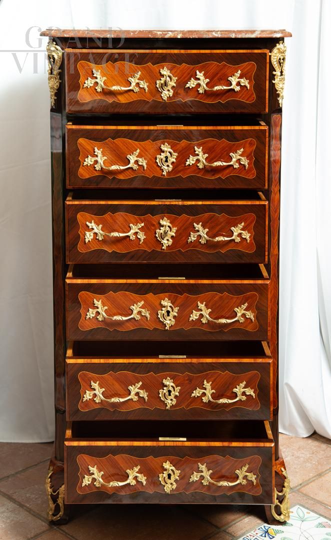 Antique Napoleon III French tallboy dresser in precious exotic woods with finely chiseled gilded bronze applications. The front is marked by six drawers adorned with finely chiselled gilt bronze locks and handles. The two corners are adorned with bronze elements, while the mixtilinear base is embellished with a frieze in the same material and ends with two cabriolet feet. A red French marble slab rests on the top. The tallboy has been restored by master craftsmen with the traditional shellac method and handmade alcohol. Provenance: France 19th century.