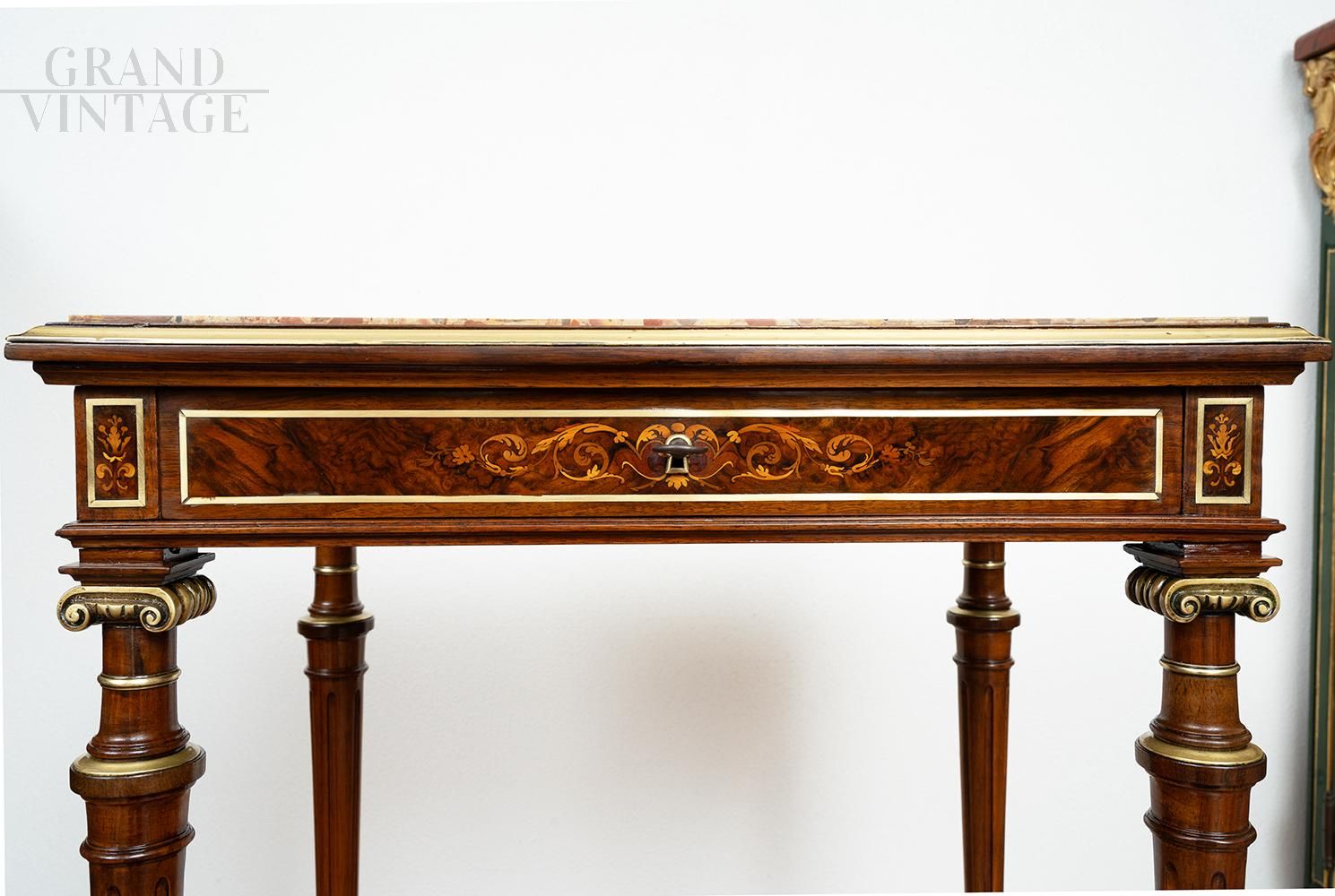 Antique French Napoleon III side table in solid mahogany with breccia marble top. The four turned feet are connected by a cross and have a gilded bronze capital in the upper part. The breccia top rests on an under-top band entirely inlaid with leaf motifs with a drawer in the centre. All the threading is in gilded bronze. Restored by master craftsmen with traditional shellac and handmade alcohol method.