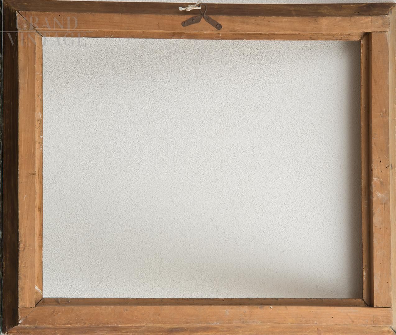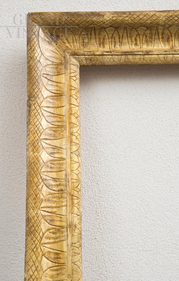 Antique Neapolitan Empire frame in gilded and carved wood belonging to the early 19th century. The entire structure is embellished with three orders of palmette carvings typical of the Empire period to which it belongs. The gilding is 24kt leaf gold on an Armenian bole layer. Provenance: Naples, early 19th century.
