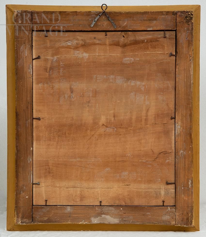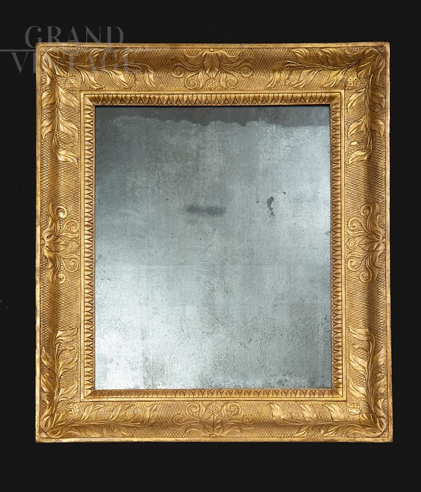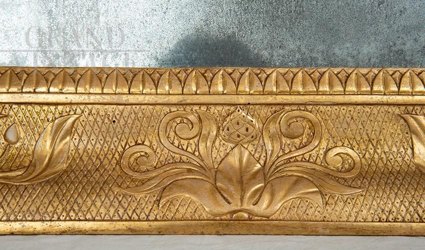 Antique Empire mirror in gilded and carved wood made in Naples at the beginning of the 19th century. The coeval mercury mirror is surrounded by a palmette carving typical of the Empire style. The entire central band is richly adorned with a floral motif carving alternating with geometric motifs.