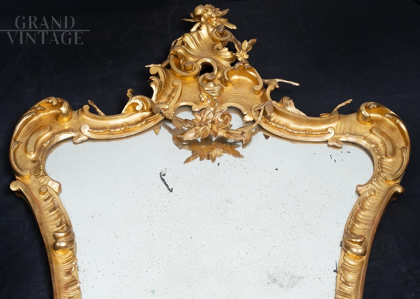 Rare antique mirror from the Louis Philippe Neapolitan era from the mid-19th century in gilded and carved wood. The particular concave-convex shape ends with a finely sculpted rocaille motif cymatium. The 24kt gold leaf gilding is placed on a layer of bole, a substance used as a base, on which the gold leaf is then placed. The mercury mirror is original from the time. Conditions: Excellent condition. Provenance: Naples 19th century.