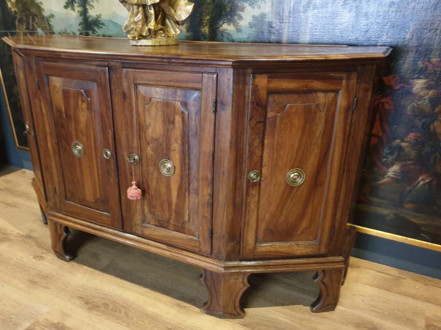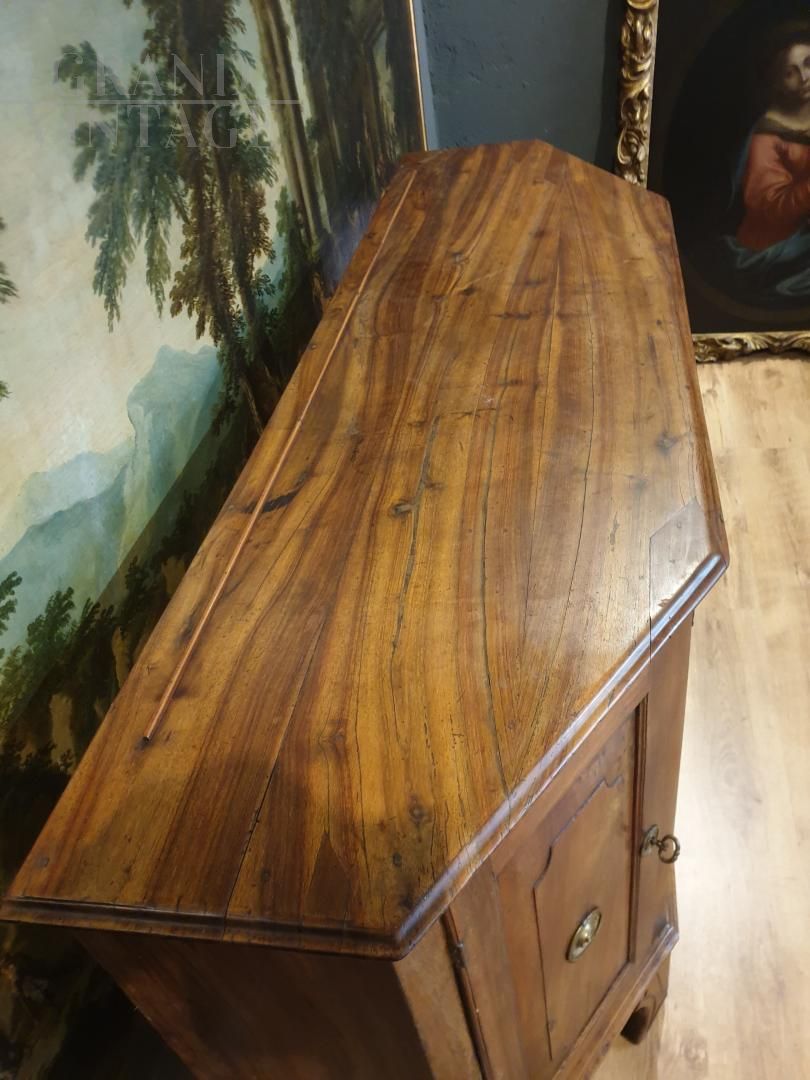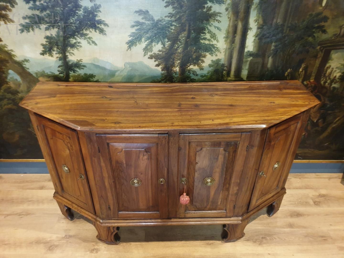 Antique notched sideboard, with beveled sides, in walnut wood, mid-eighteenth century, of Venetian origin, in good general condition for the period, of good quality, in need of restoration as it shows some signs of time. It comes from a private collection.