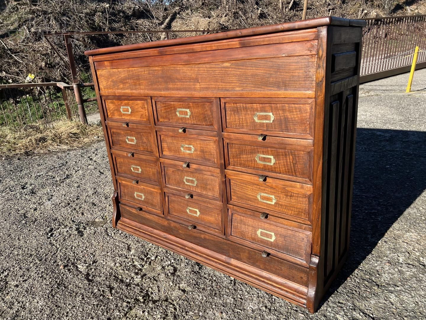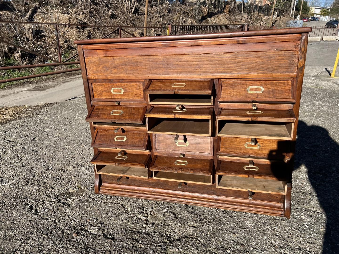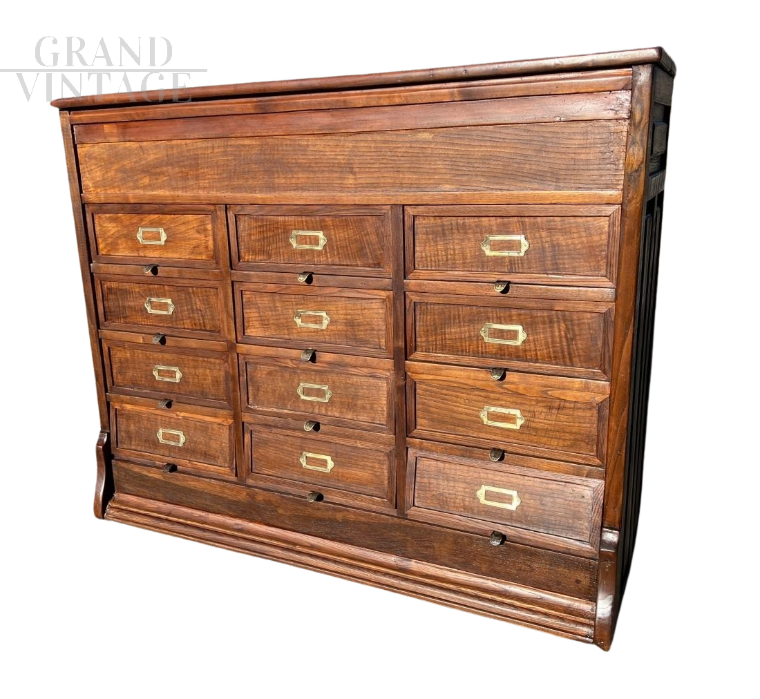 Stunning antique office drawer unit filing cabinet in oak and cherry wood, recently restored, from a lawyer's office in Milan, Italy.