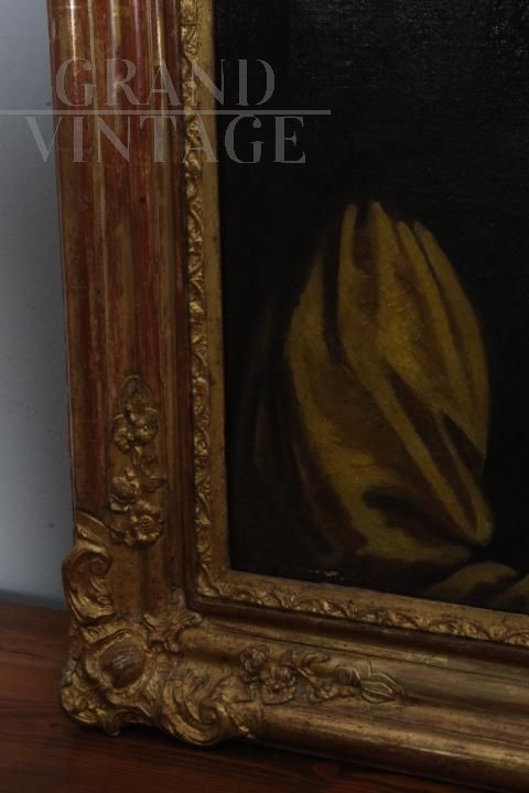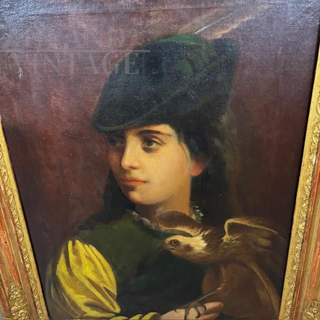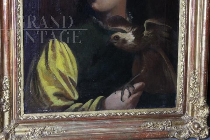Antique oil painting on canvas from the early 19th century depicting a young falconer boy, of beautiful quality, complete with antique coeval frame covered with gold leaf. In very good condition.