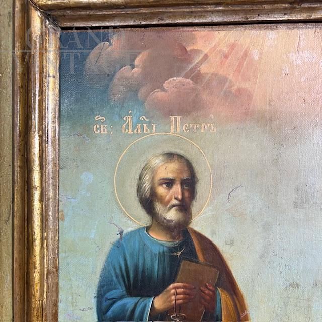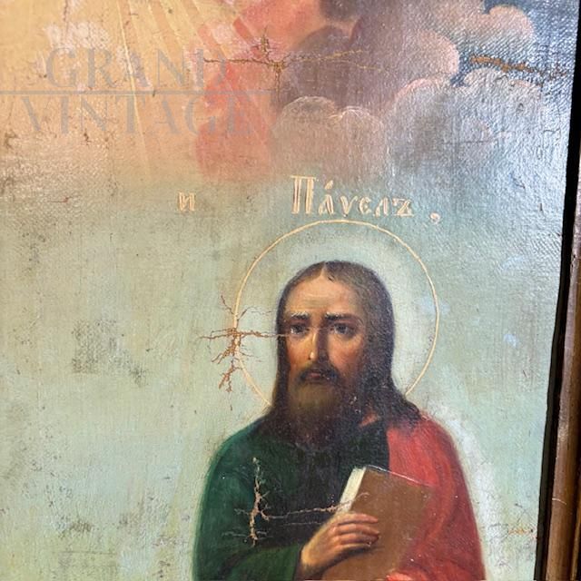 Antique Russian oil painting on canvas from the 18th century depicting Saint Peter and Saint Paul, very beautiful workmanship, in good condition with small signs of wear. The contemporary frame is lacquered in green and gold.