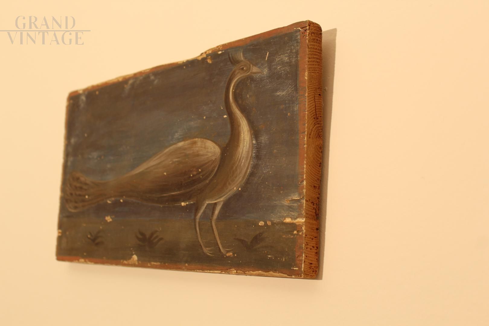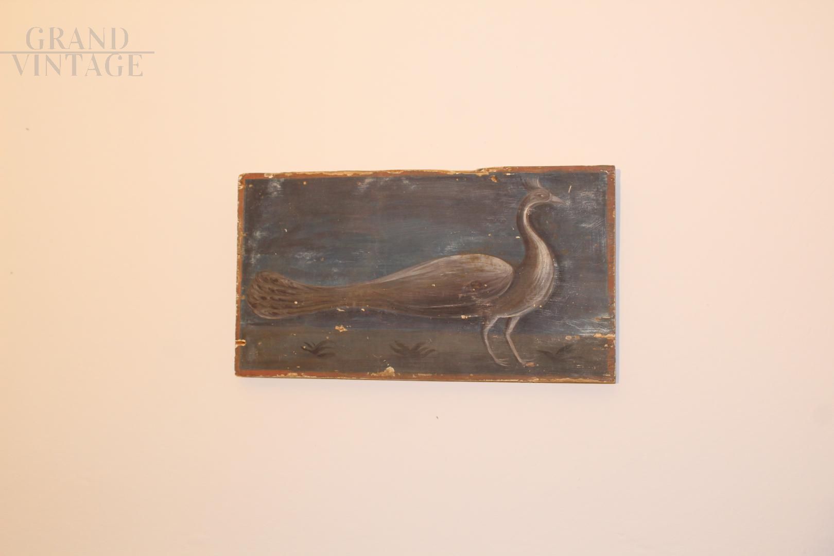 Antique painting on wood with peacock, late 19th century