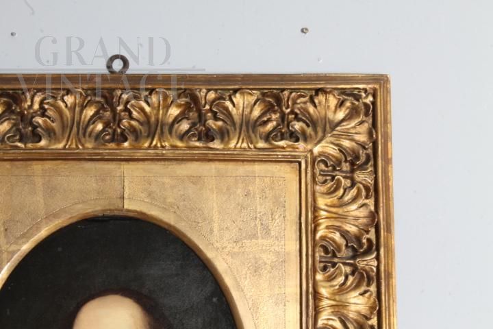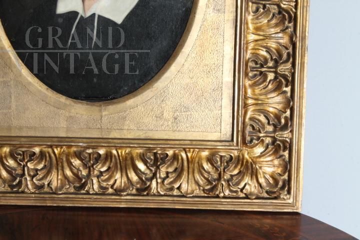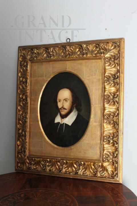 Antique oil painting on canvas depicting the portrait of the famous writer Shakespeare, in a splendid 18th century papier-mâché and gold leaf frame.