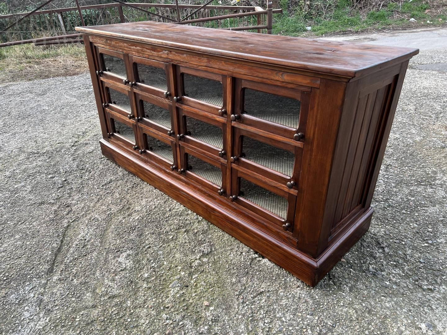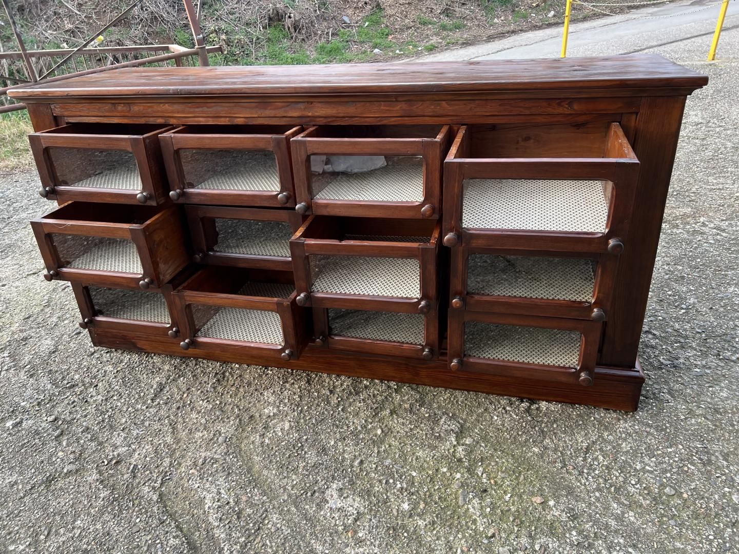 Stunning pasta shop or gricery store counter cabinet in solid larch with 12 glass drawers, completely original and recently restored, coming from a historic grocery store in Milan.