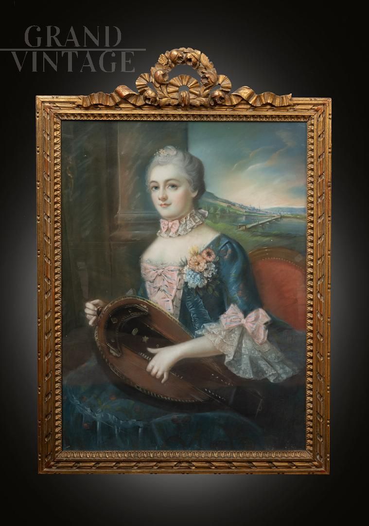 Antique pastel painting with coeval frame belonging to the Napoleon III period of the late nineteenth century. The noblewoman of high social standing is portrayed half-length, wearing a soft dress in blue and pink textured fabric with lace running along the neckline. The woman is portrayed in the foreground while playing the hurdy-gurdy and has a river landscape behind her. Note the careful rendering of the facial features, the attention to the nuances of the complexion, the sharpness of the contours underlined by the light. Conditions: Good condition.