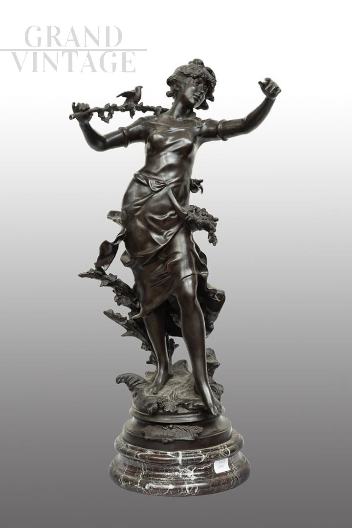 Antique patinated bronze sculpture signed "Louis Moreau" resting on a red Levanto marble base. The sculpture depicts the Nymphe de Bois and is a captivating representation of the mythical wood nymph from ancient legend, created by Louis Moreau, one of the extraordinary members of the Moreau family who dominated the world of sculpture in Paris during the second half of the 19th century and the early 20th century. The young woman is depicted in a joyful pose, surrounded by plants and birds, and rests on a base also made of plants. Draped around her hips, the figure is in a sensual and contemplative pose; her body is supple, slender, and beautifully modeled with anatomical care and naturalistic detail.