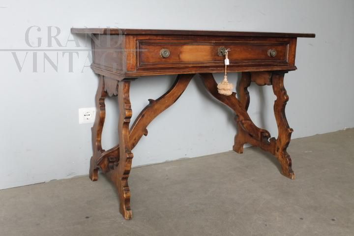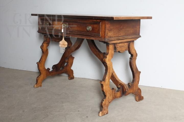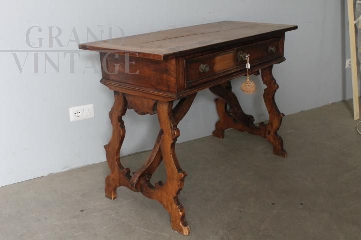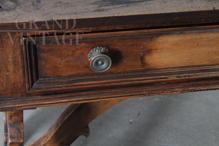Antique Italian Piedmontese refectory table or desk from the mid-18th century in solid walnut with a large central drawer, the legs are connected by shaped wooden elements. In good condition, not restored, restoration work can be carried out on request.