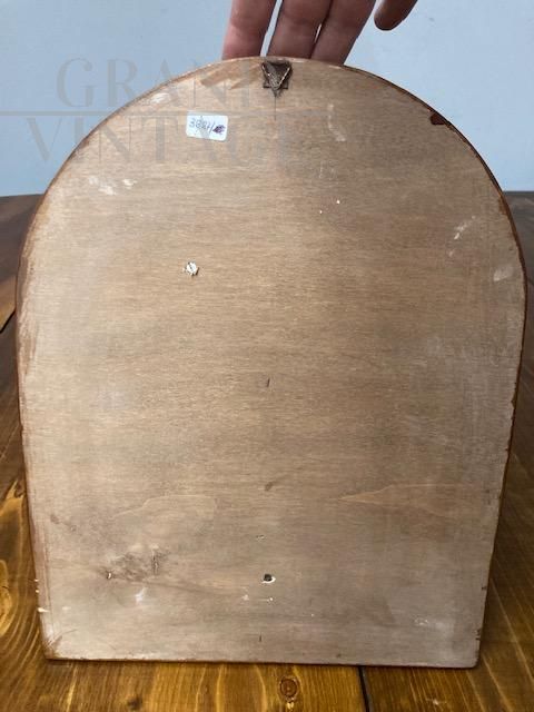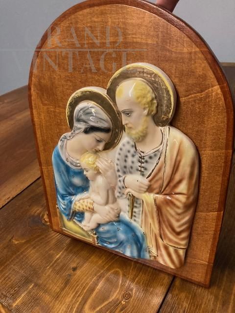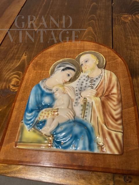 Antique bedhead plaque in polychrome majolica ceramic depicting the Holy Family in very sweet poses, from the Tuscan area - Mica Sesto Fiorentino, 1940s, signed on the back, on a wooden base. In excellent condition.