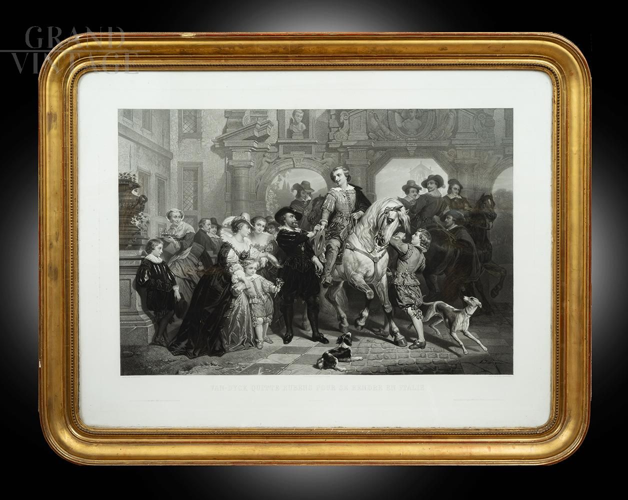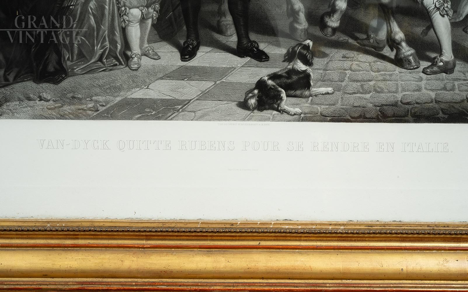 Antique French Napoleon III era print with contemporary frame depicting Van Dyck greeting Rubens to come to Italy. The scene is full of characters and the two artists are put in the foreground at the moment of greeting. In the background there is an architecture with a landscape behind it.