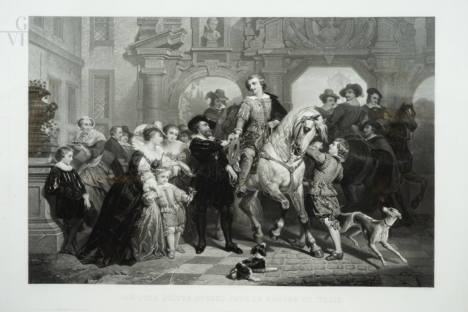 Antique print depicting Van Dyck greeting Rubens to go to Italy