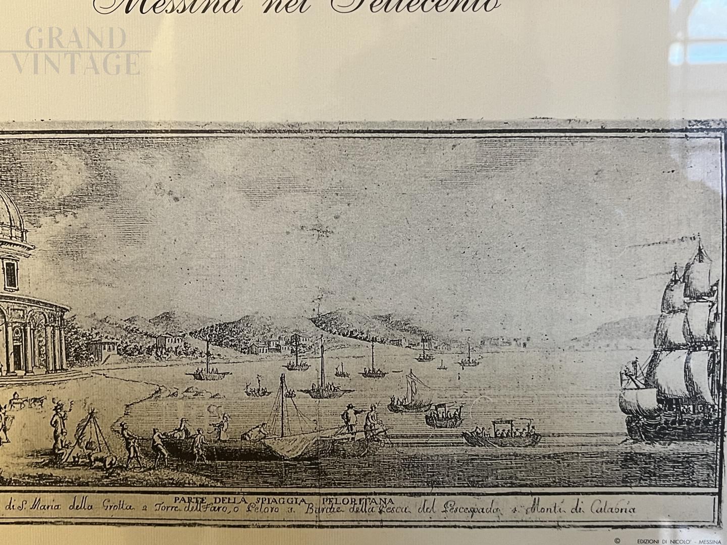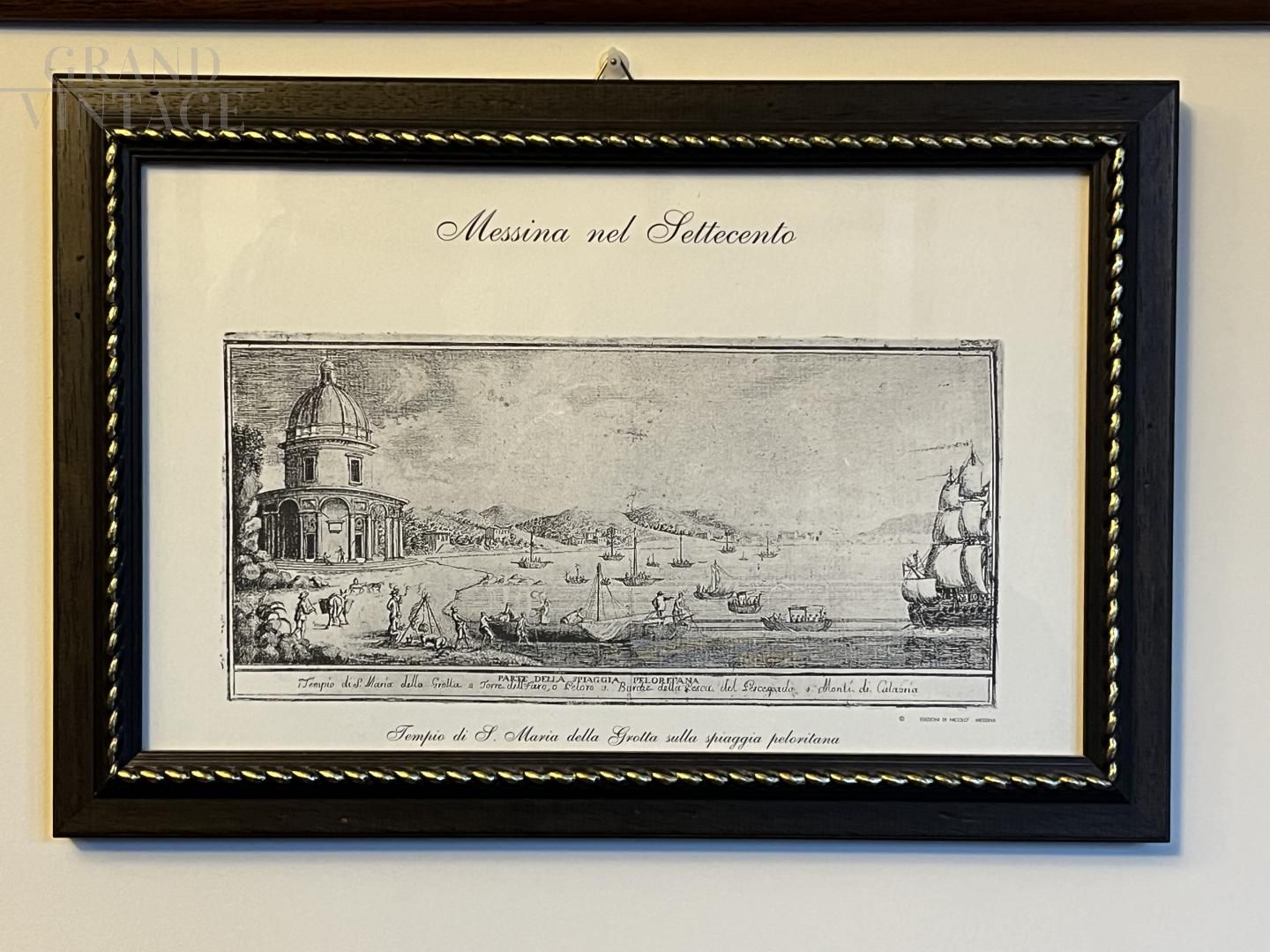 Antique print with an eighteenth-century view of the Italian city of Messina depicting the Temple of Santa Maria della Grotta on the Peloritana beach. Printed on paper by Edizioni di Nicoló, Messina. The print is framed and in excellent condition.