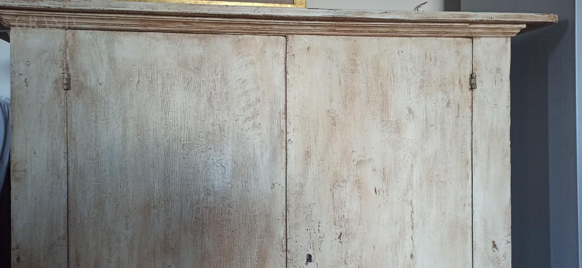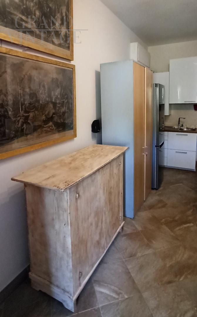 The sideboard was purchased from a sixteenth-century villa in Genoa, Italy. The cabinet shows its original doors with the antique locks and hand-chiseled wrought iron hinges. Originally the piece of furniture was used as a wall unit, after it has been adapted to a sideboard with a top in precious cypress wood, a wood that does not bite and is considered a natural repellent for various insects.