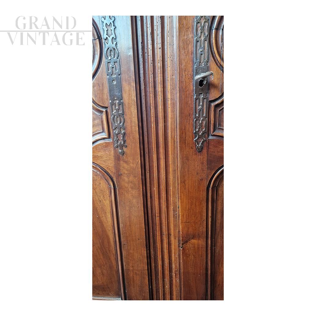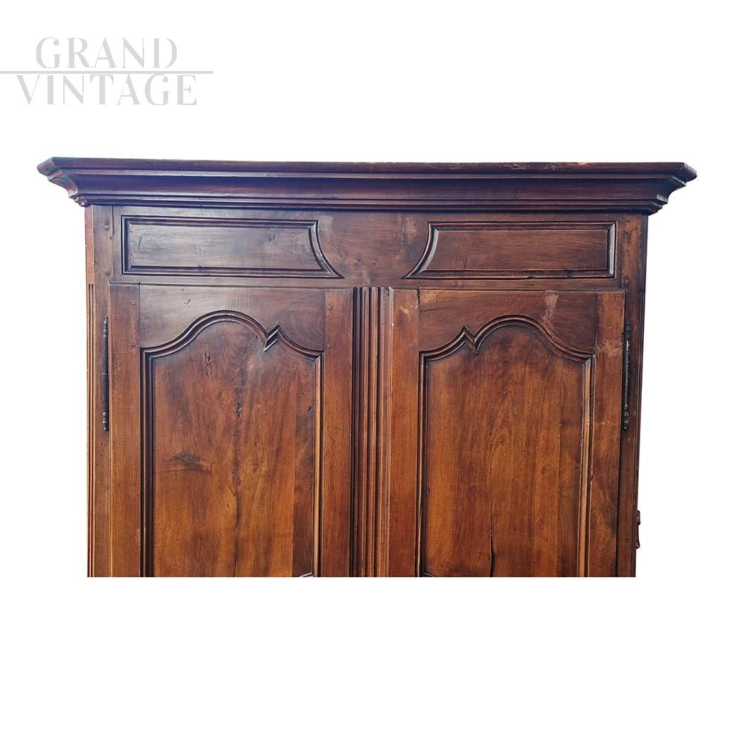 Antique two-door Provençal wardrobe from 19th century France, made of walnut and supported by beautiful wavy feet, on the front it has two paneled doors with carved and shaped frames. Working key lock and original hardware.