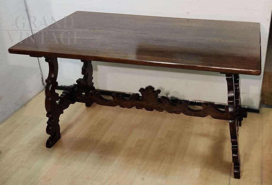 Original antique Italian refectory table from the early 19th century in solid national walnut, with richly carved structure and single plank top with a thickness of 30 mm. Restored table in excellent state of conservation, with t.walnut shellac and wax finishes.