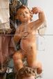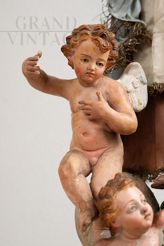Antique Neapolitan religious sculpture depicting the Immaculate Virgin. The sculpture has a terracotta head with crystal eyes and polychrome wooden hands and feet. The Virgin has a silvered bronze crown, and is depicted in her classic attitude as she crushes the dragon, flanked by a host of cherubs. Two cherubs appear to be coeval with the same. The clothes are coeval and naturally worn by time.