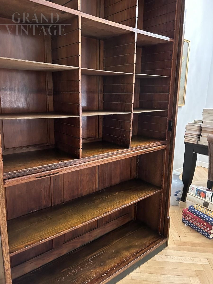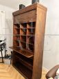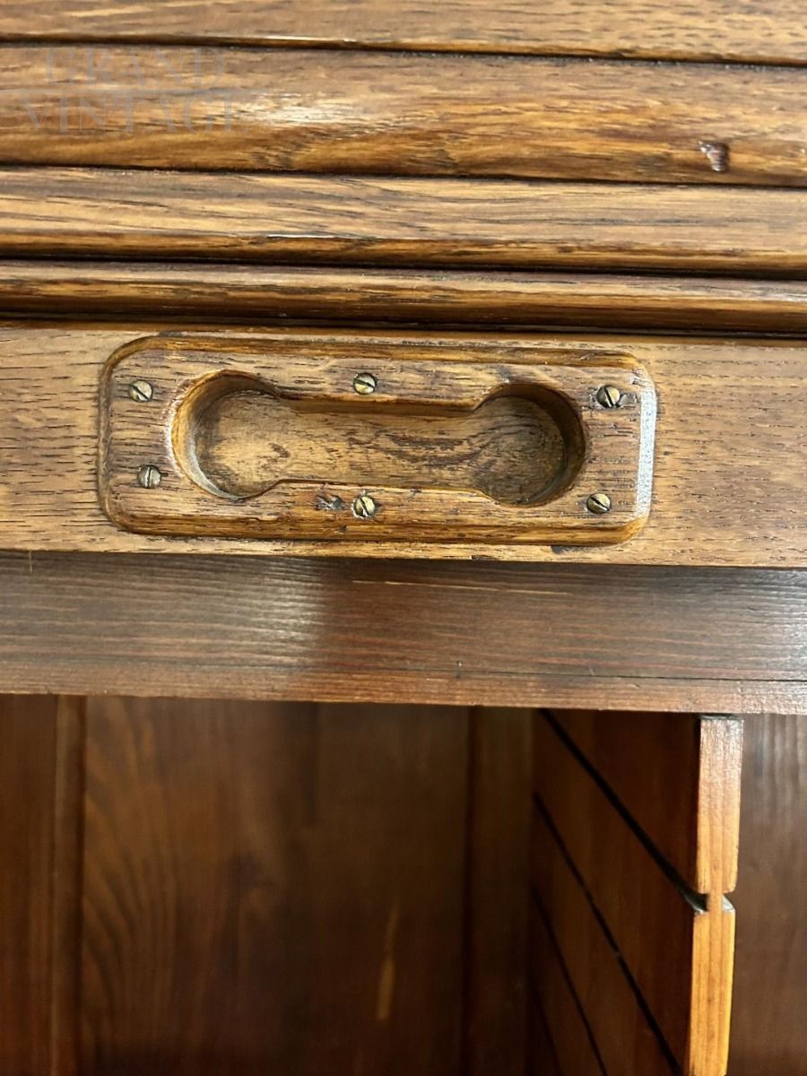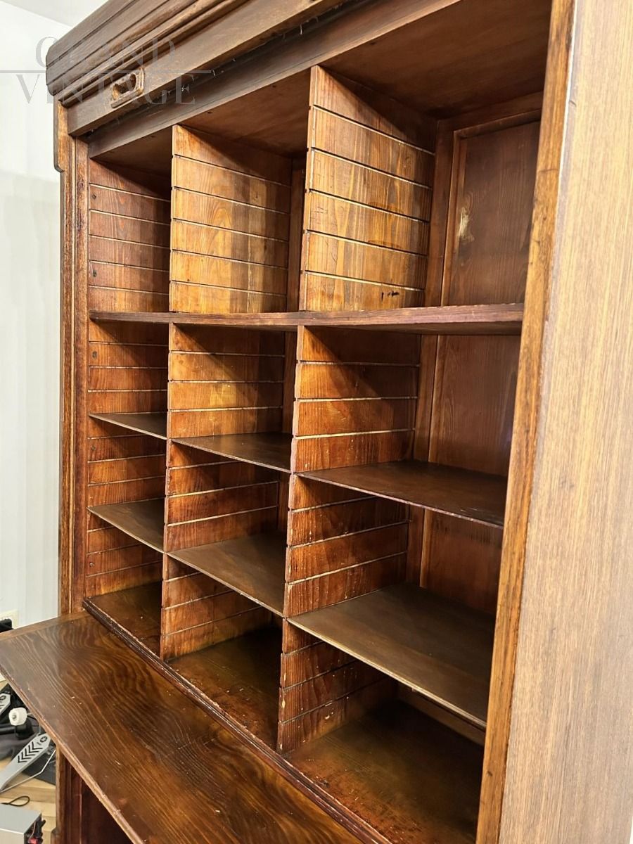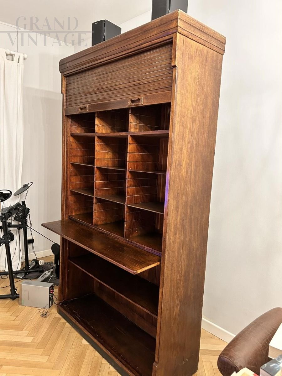 Antique wooden office bookcase with rolling shutter closure from the early 1900s, very beautiful and very well maintained, has a retractable shelf to place a book or any object, or to use as a writing surface.