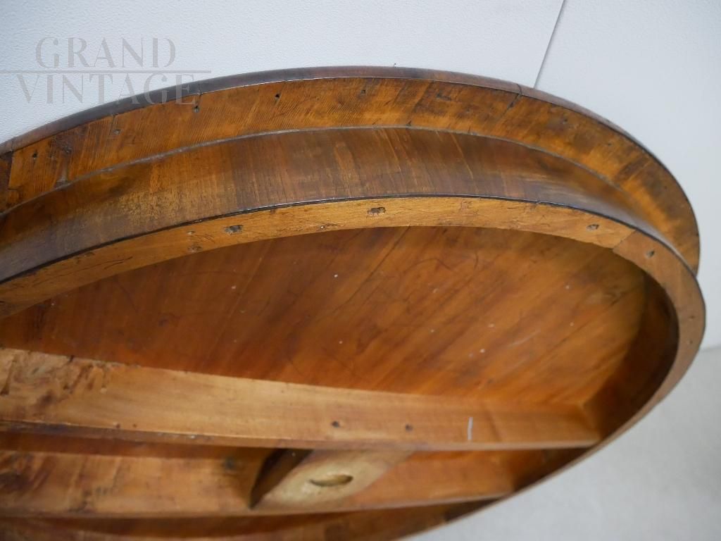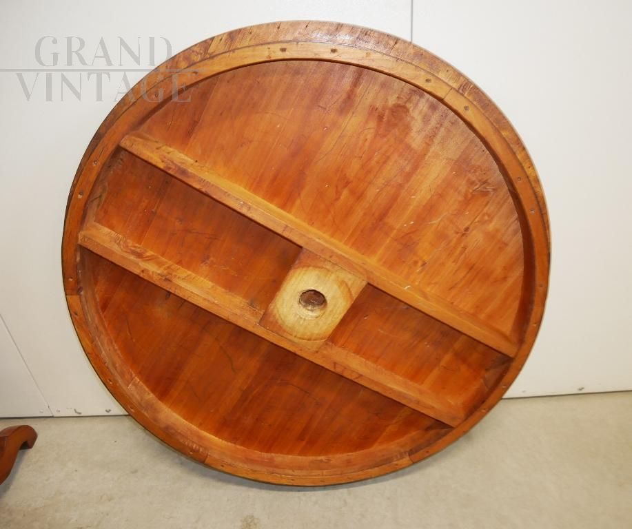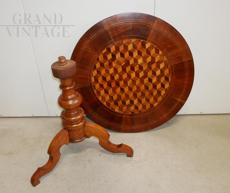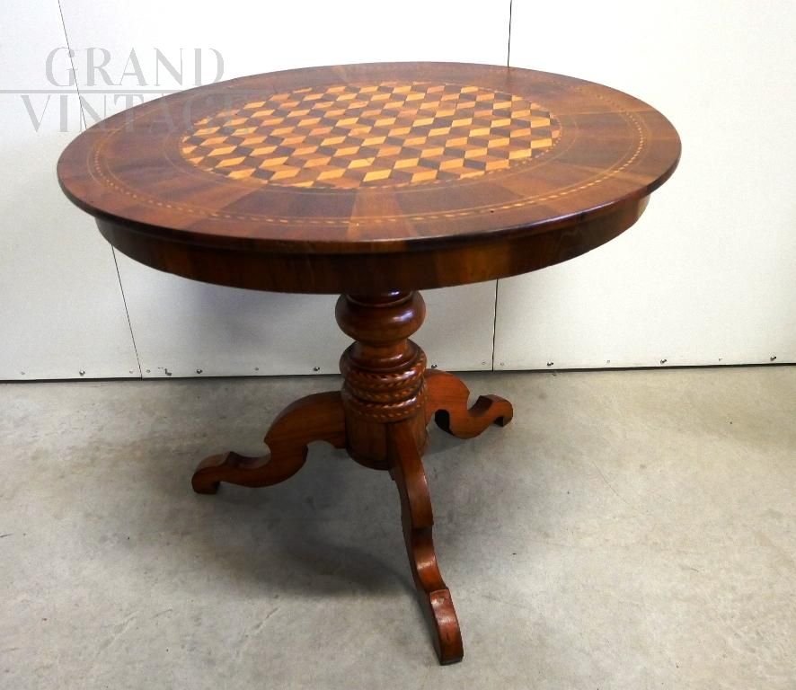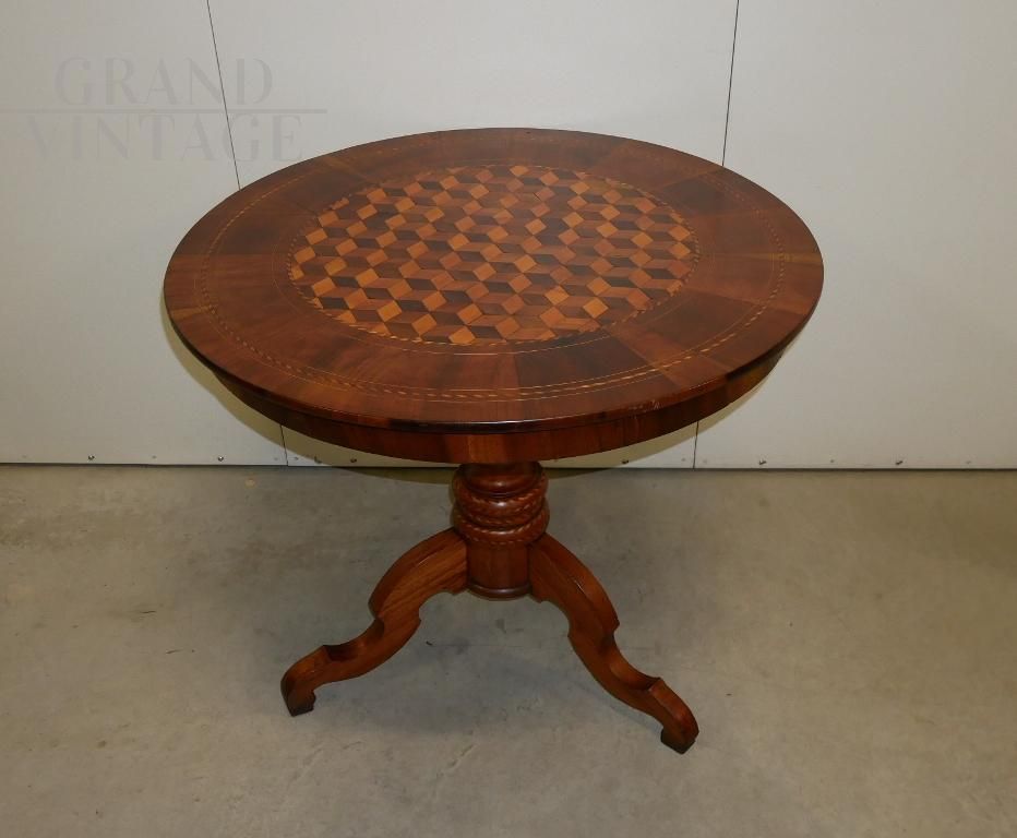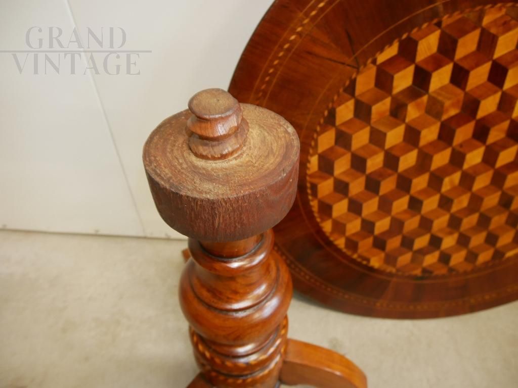 Antique round side table with rich geometric Rolo inlay on the top, made in Italy - Emilia towards the end of the 19th century. The round top has a diameter of 88 cm and is veneered in walnut and other precious woods, with the central part inlaid with geometric patterns. The central leg is in solid elm, turned and with small inlays, and branches into three feet. The top is mounted on the leg thanks to a screwing mechanism. In excellent general condition.