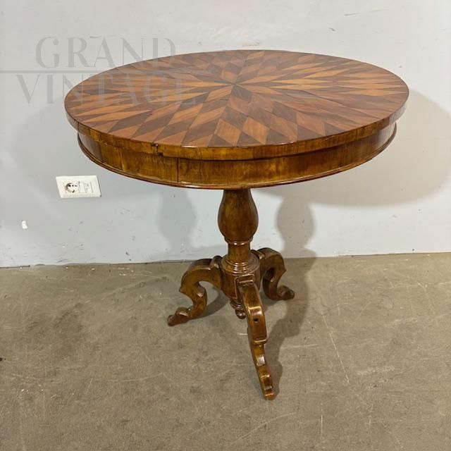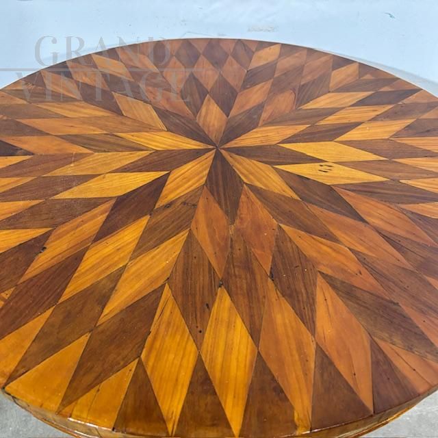 Splendid round walnut table with a central leg and top featuring an elaborate Rolo inlay with a geometric diamond pattern in various woods, Italy early 19th century. The central leg ends with three feet. In very good condition, the nails under the top are original antiques.