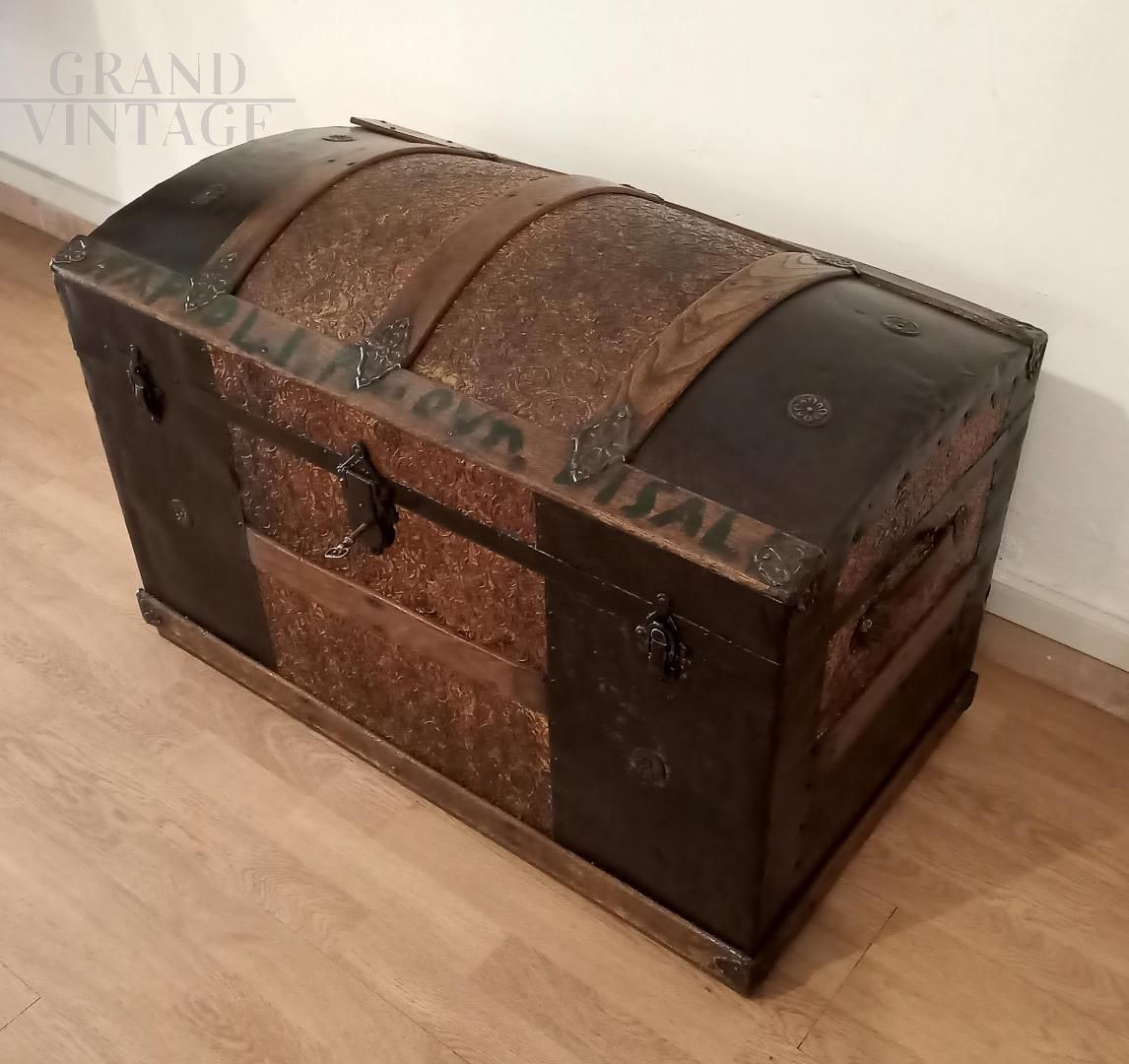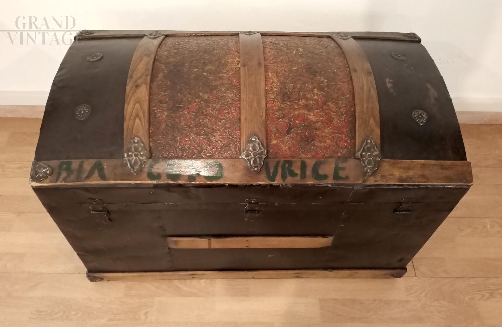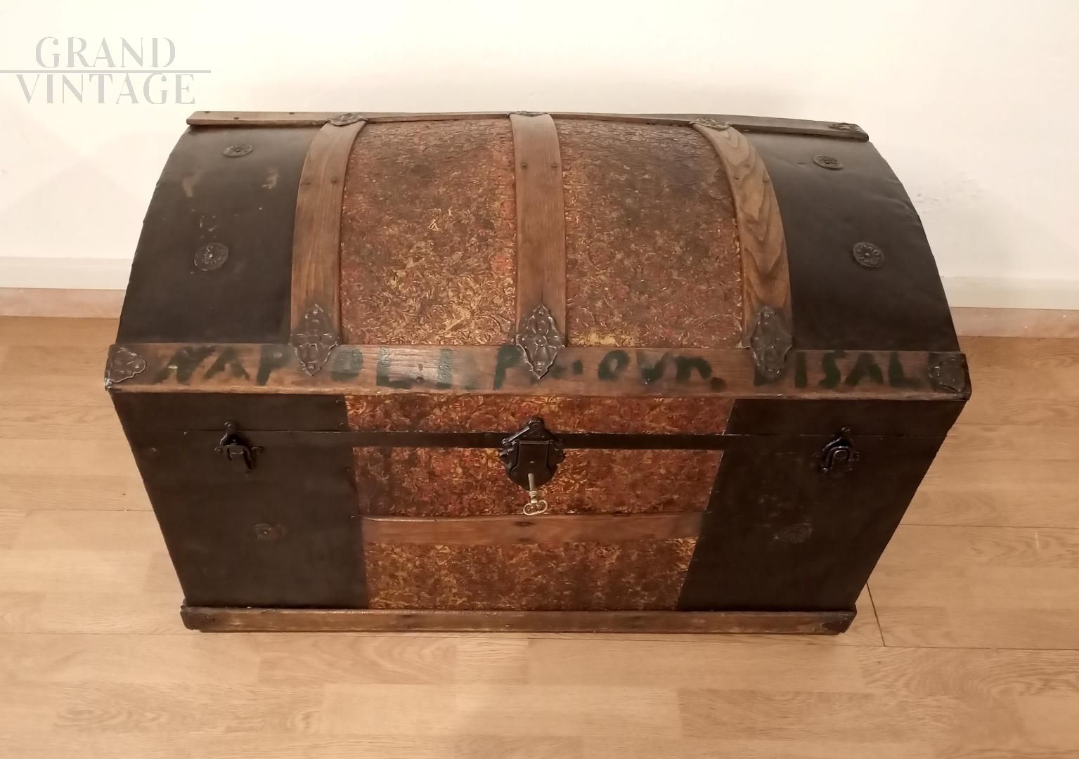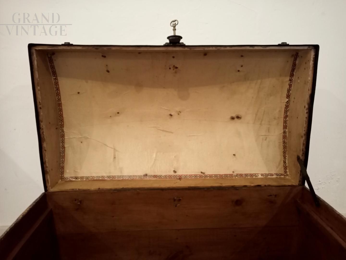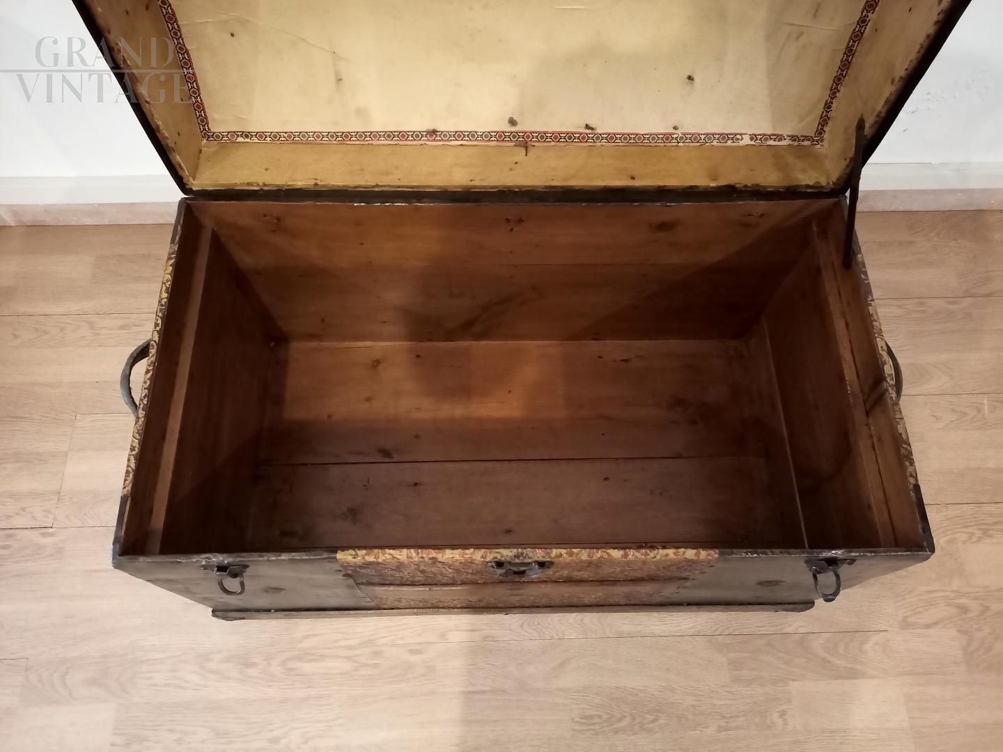 Antique 19th century chest in wood and iron, aesthetically very pleasant, with poplar wood structure covered in wrought iron and decorated on the entire visible surface. External reinforcements in hard wood, probably oak. Designed for ship travel in extreme transport conditions, very solid and resistant. The aesthetic appearance is very refined, with floral decorations painted on the sides and lid. It can be closed with two side hooks and a lock with a central key. Completely original in all its parts with the exception of a leather side handle, replaced because it was missing, and the key, also lost and replaced with a key of the same period and style as the trunk. It features inscriptions on the lid of the owner and the journey he took.