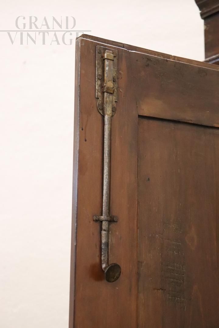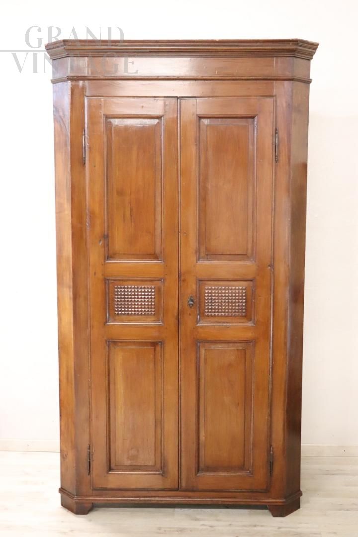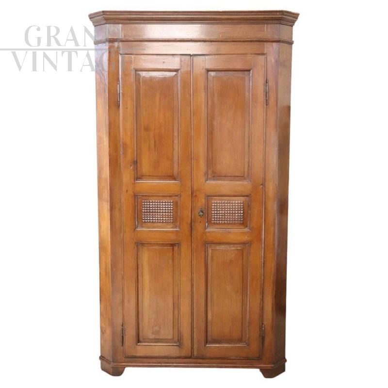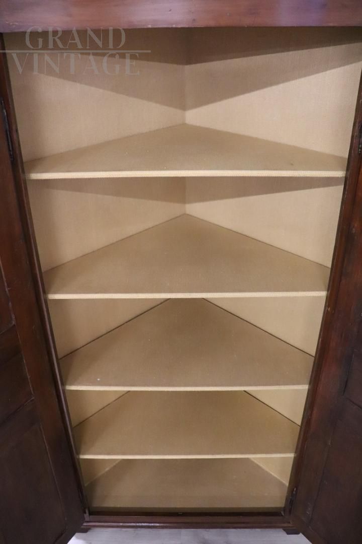 Antique rustic corner cupboard, dating back to the early twentieth century. High-quality furniture made of solid walnut wood in a blonde tone. The cabinet is characterized by two doors on the front with squared panels and central decoration. Internally, the large useful space is equipped with four shelves, and is all lined with elegant yellow fabric. In good general condition, perfect for decorating a corner of the house. Offered at an excellent negotiable price.