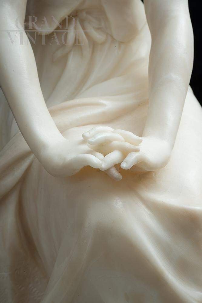 Antique French Napoleon III sculpture in alabaster belonging to the second half of the 19th century. The woman in a romantic attitude is represented sitting on a rock with her hands crossed intent on looking at an amphora under her feet. In particular, our sculpture denotes stylistic characteristics, such as the solid structure of the volumes and the way in which the face was created. The care and precision of the details, the fineness of the face of the robes are of the highest quality.