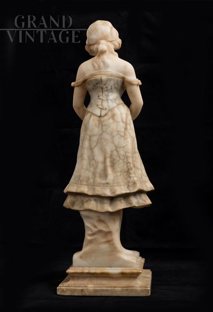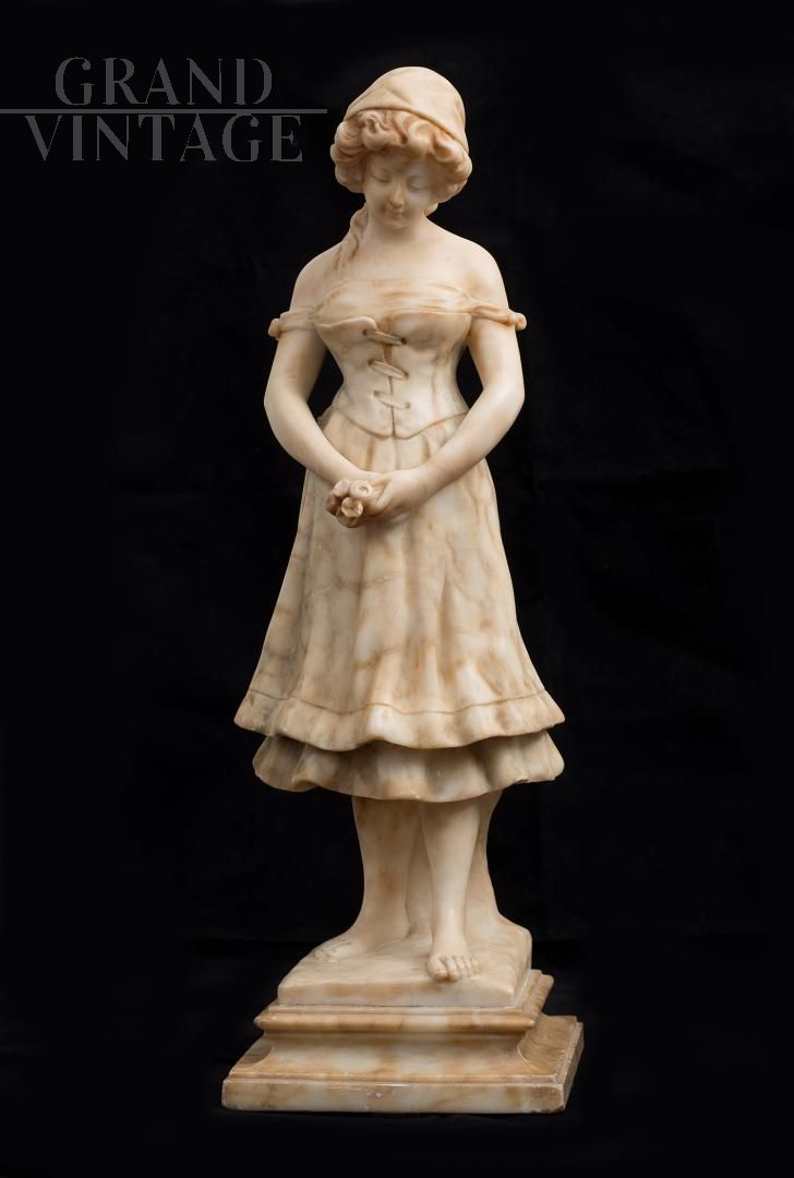 Antique French Napoleon III alabaster sculpture belonging to the second half of the 19th century. The woman is represented with period clothes and hat while holding a bouquet of flowers in her hand. Conditions: Excellent condition. Provenance: 19th century France.