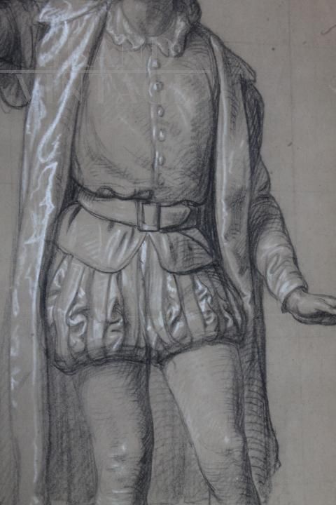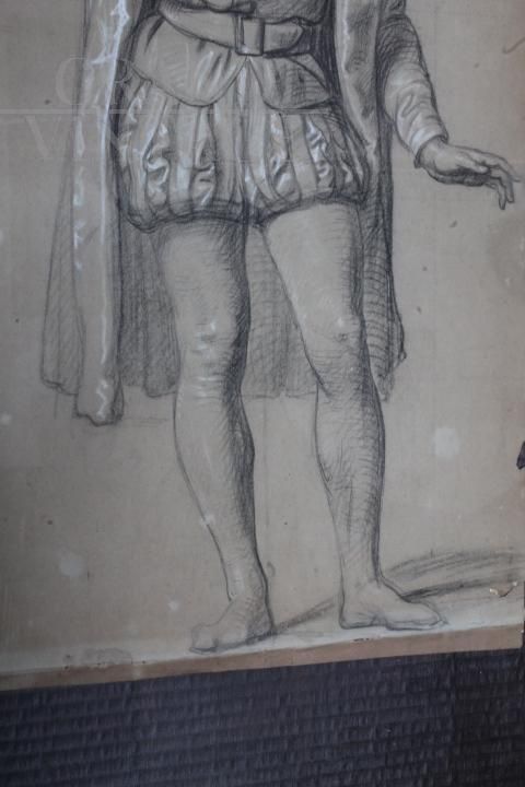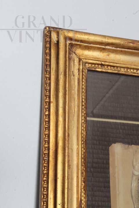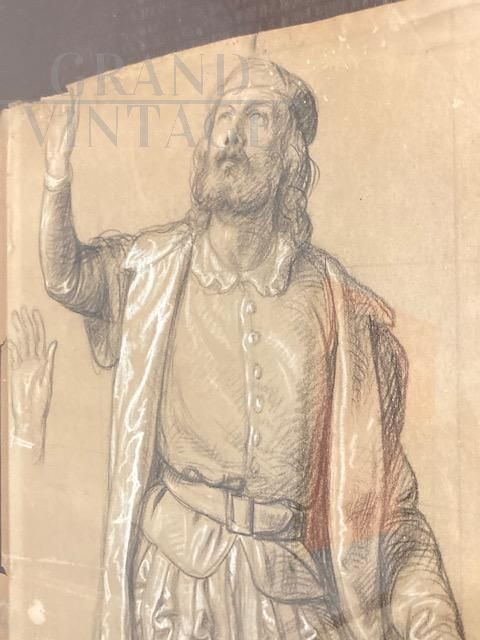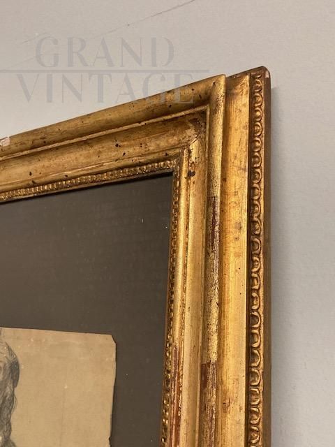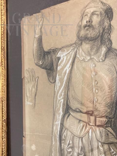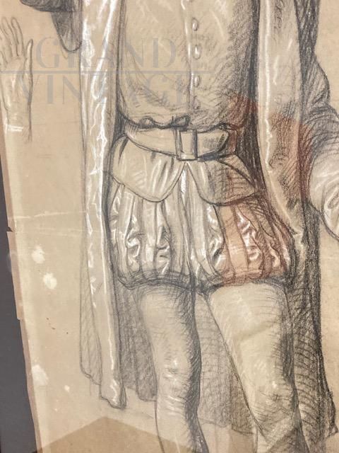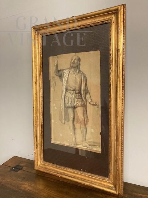 Antique 19th century drawing with a sketch of a noble character in period costume, in an antique coeval gold leaf frame. Excellent state of preservation.