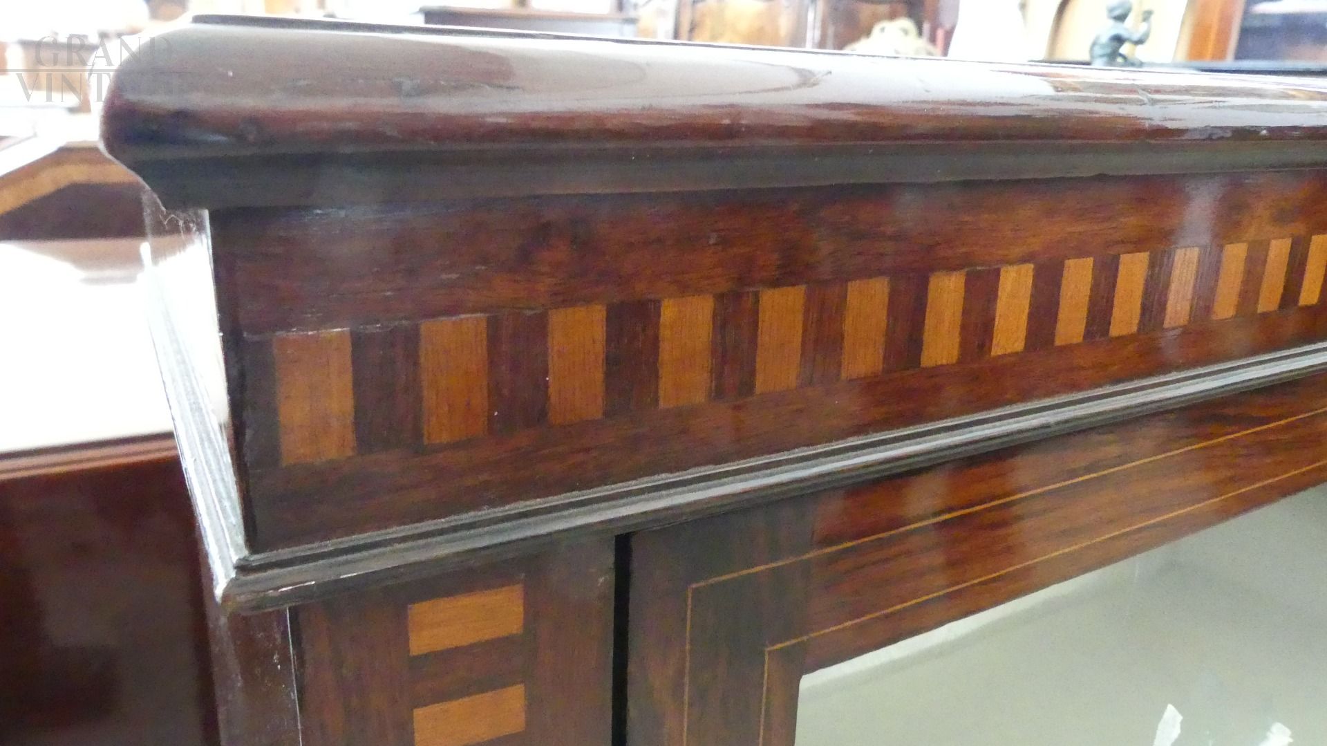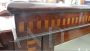 Small antique English living room display cabinet made between 1850 and 1970 in mahogany and walnut, with precious inlay threads.