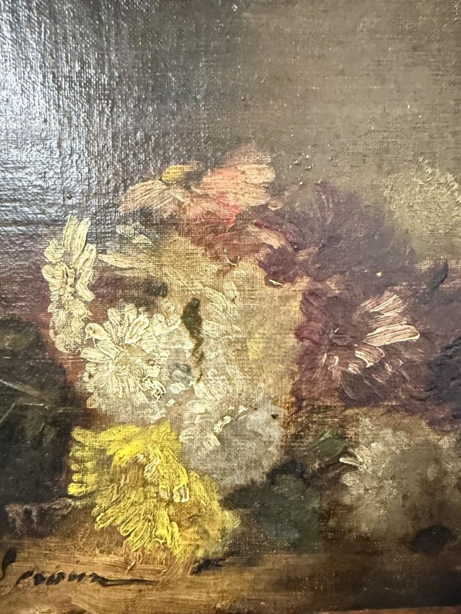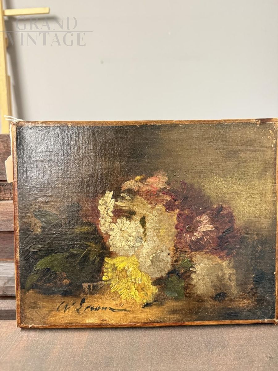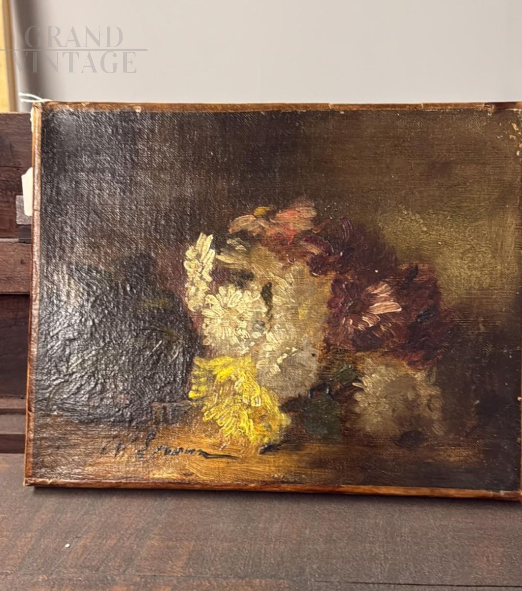 Antique small oil painting on canvas depicting still life with flowers, 19th century, 29 x 39cm, of good quality and in good condition. Signed.