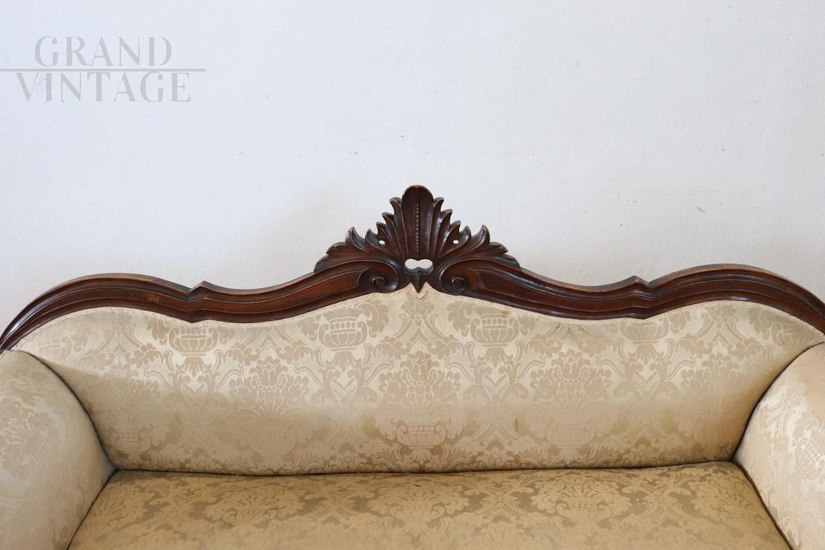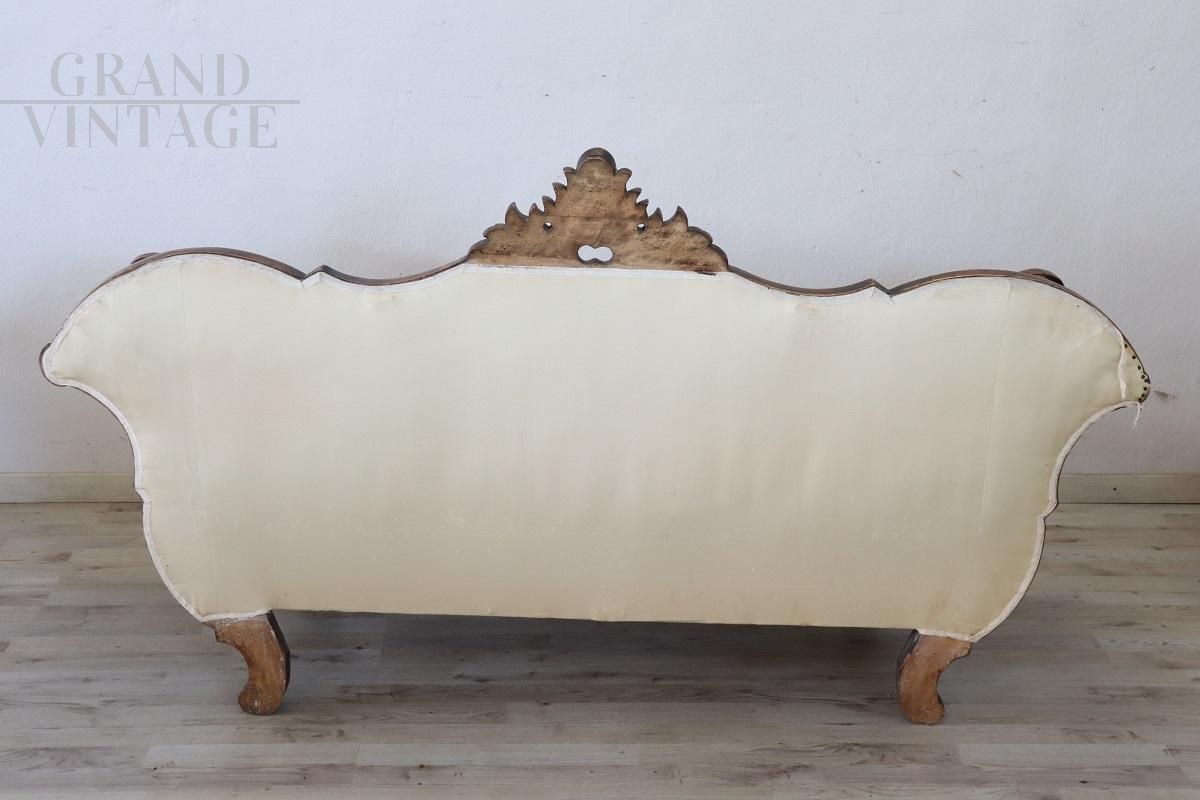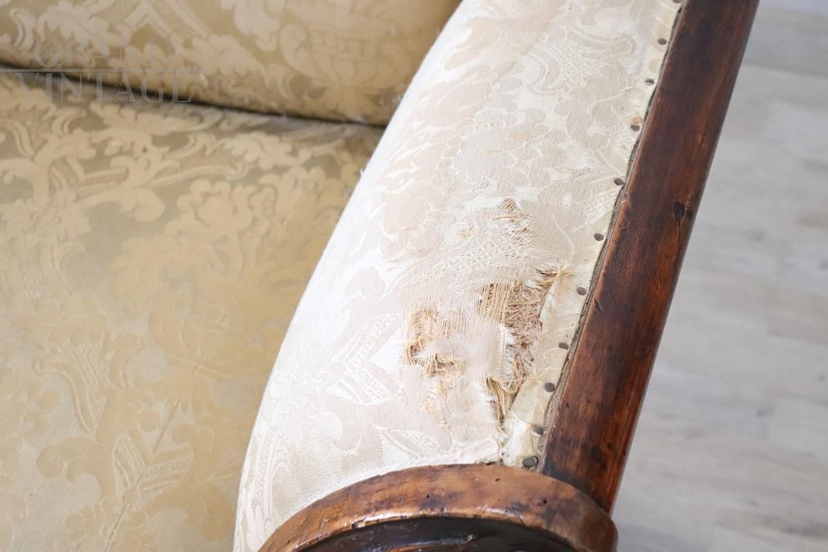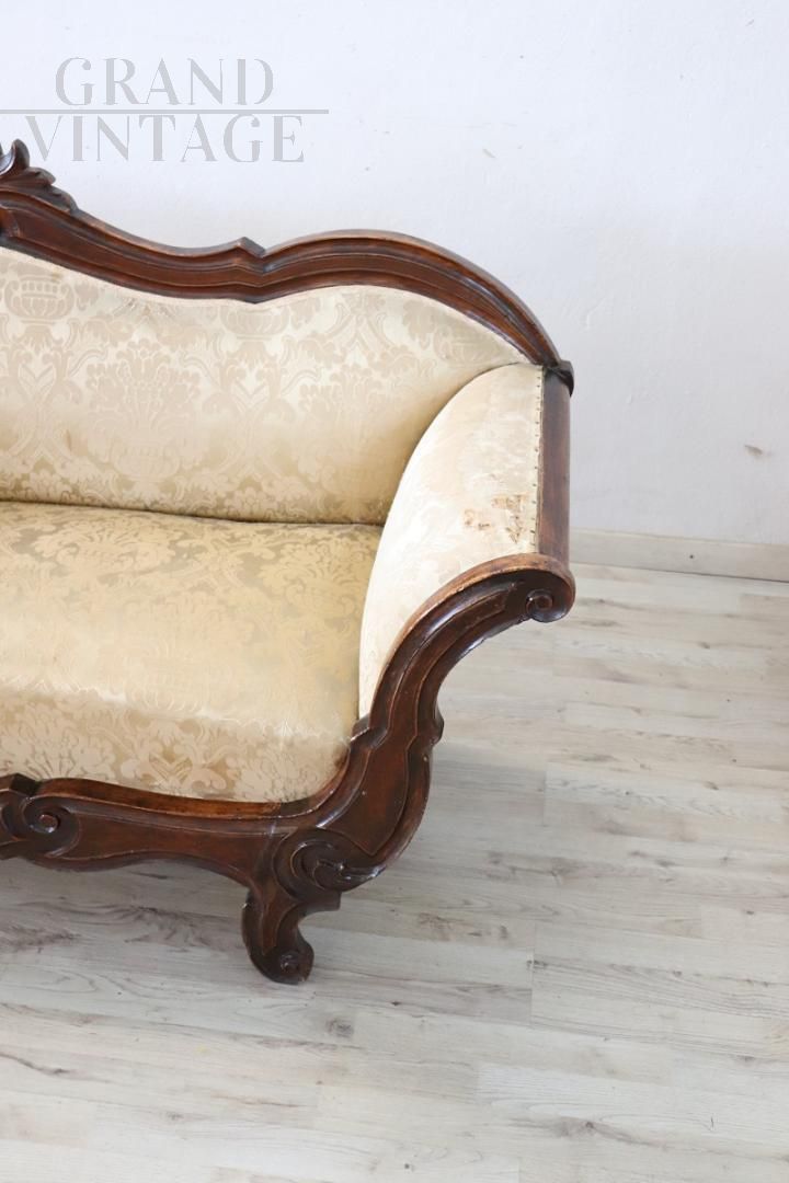Antique Italian sleigh sofa from around 1845, Louis Philippe period, made of solid hand-carved walnut wood. In good wooden condition with a particular wavy shape. The advantageous price is due to the necessary replacement of the worn fabric, and a remake of the padding is also recommended. Excellent negotiable price.