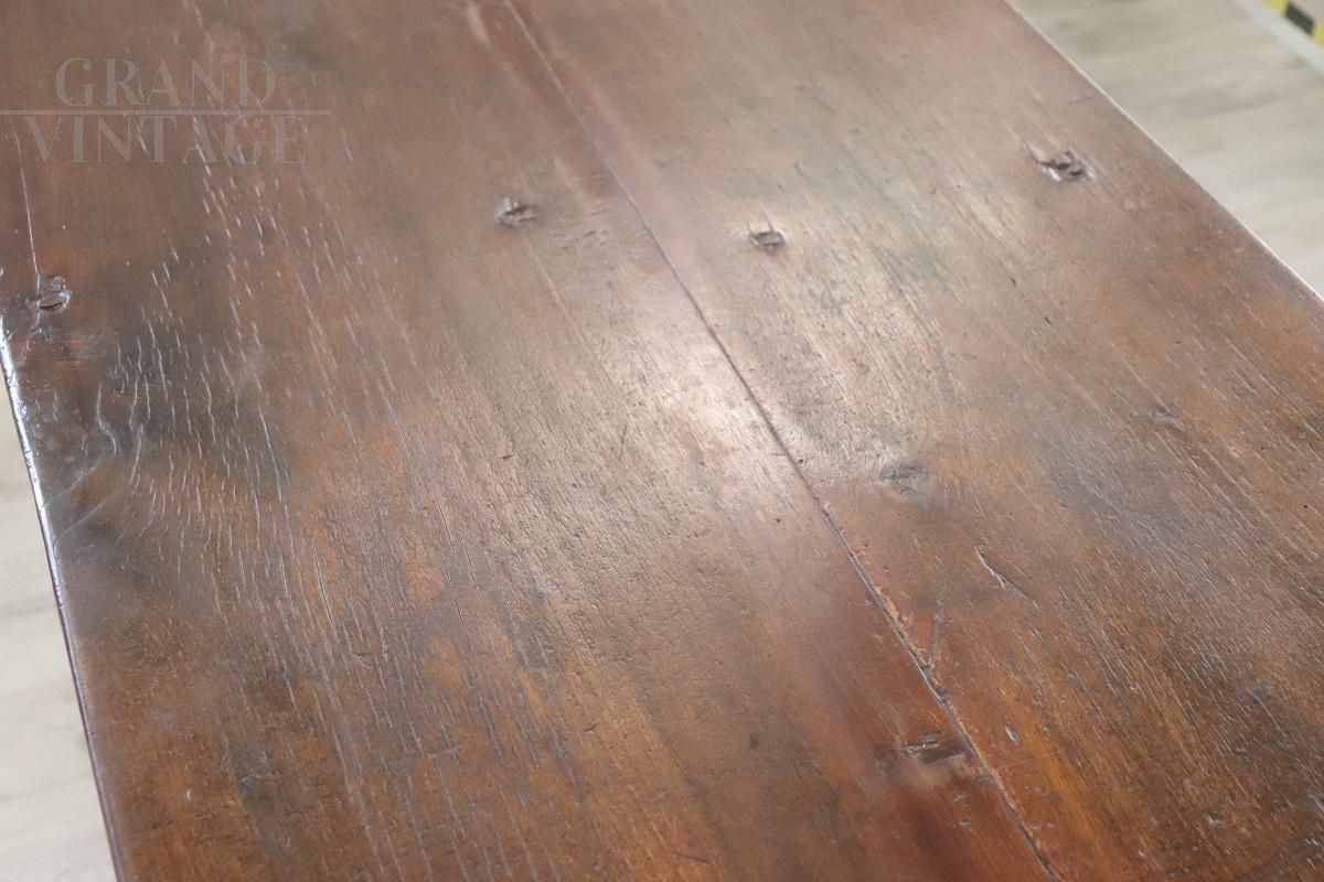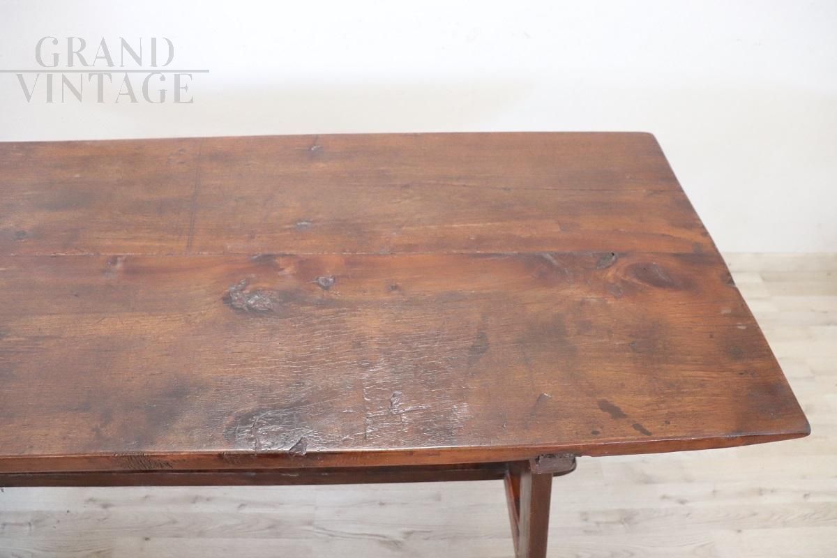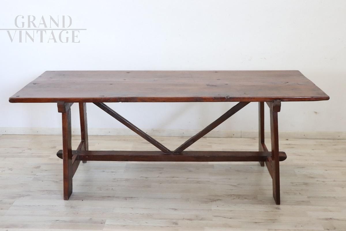 Majestic antique refectory dining table in solid oak, made in Italy and dating back to the early 19th century. This table is crafted from solid oak, its rectangular top supported by trestle legs, while crosspieces in the center ensure the stability of the long tabletop. The table's distinctive feature is its imposing 200 cm length. These tables, very simple in construction and unadorned, were made for use in convents and were called "fratini." Conventual communities used them in the rooms designated for the friars' meals. The table is in excellent condition; a conservative restoration has restored its beauty without erasing any traces of its ancient charm. Price negotiable.