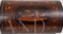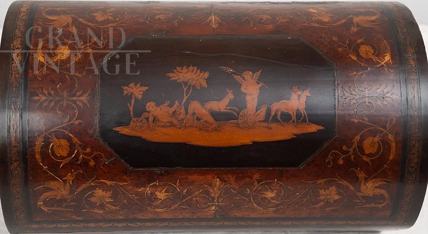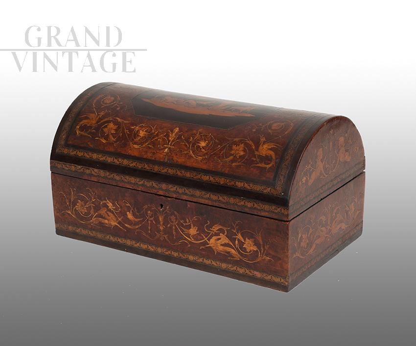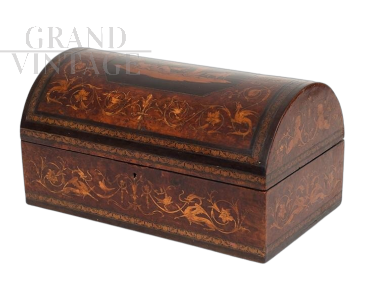 Antique Sorrento jewelry box in precious exotic woods belonging to the second half of the 19th century. At the center of the lid there is an ebonized medallion where there is a scene depicting a chariot transported by goats. On the front and on the sides there are scenes of cherubs alternating with vines and griffins. Provenance: Italy, Sorrento 19th century.