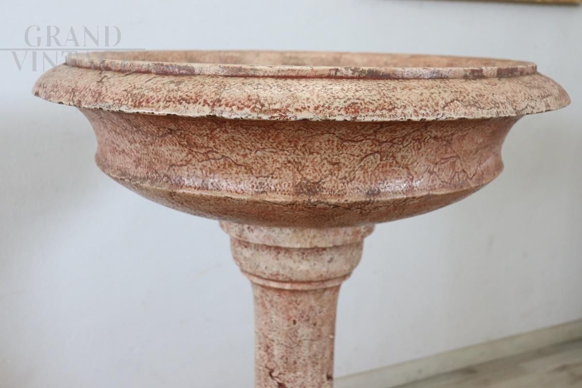 Rare antique Italian column stoup, made of carved and enamelled stone with a red marble effect, dating back to around the beginning of the 20th century. Its style is classic with a circular basin with a molded edge supported by a multi-order turned balustrade and a square foot. The stone has been glazed in red to give a marble effect. In good condition, it shows natural signs due to wear and the passage of time. This stoup is ideal for use as a decorative element both indoors and outdoors. Offered at an excellent negotiable price.
