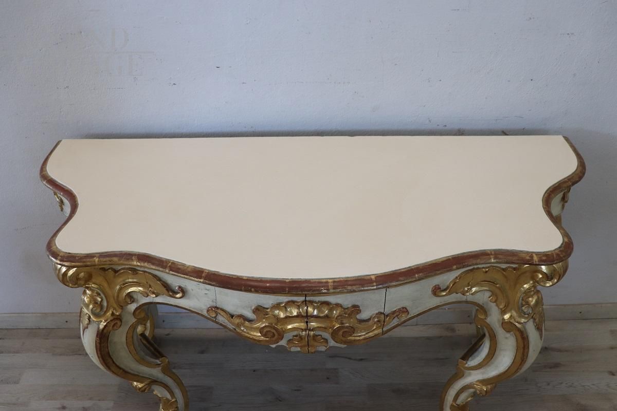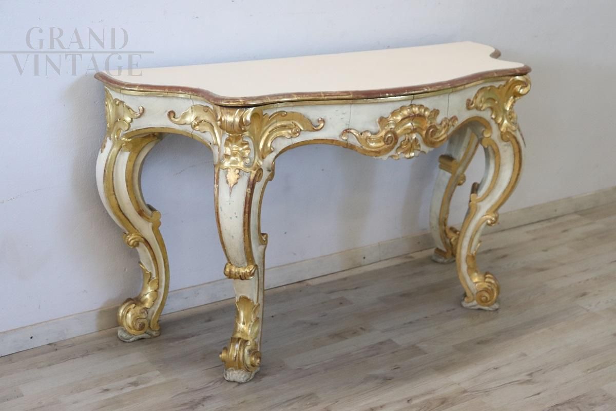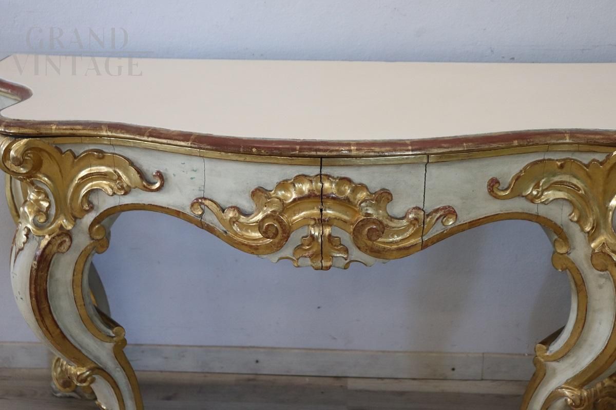 Beautiful 20th century console with a design that recalls the Baroque era, characterized by rich decorations and intricate workmanship. Made of wood, the console is decorated with relief carvings of acanthus leaves, shells and curls. The base is lacquered while the decorations are gilded with gold leaf, indicating fine workmanship. It presents the natural signs of aging, particularly evident in some parts of the lacquering and gilding, but the console top has recently been restored with a new lacquering, improving its overall aesthetic appearance. The console is versatile, ideal for decorating an entrance or a room and can be combined with a painting or a mirror for a touch of classic elegance. Price negotiable.