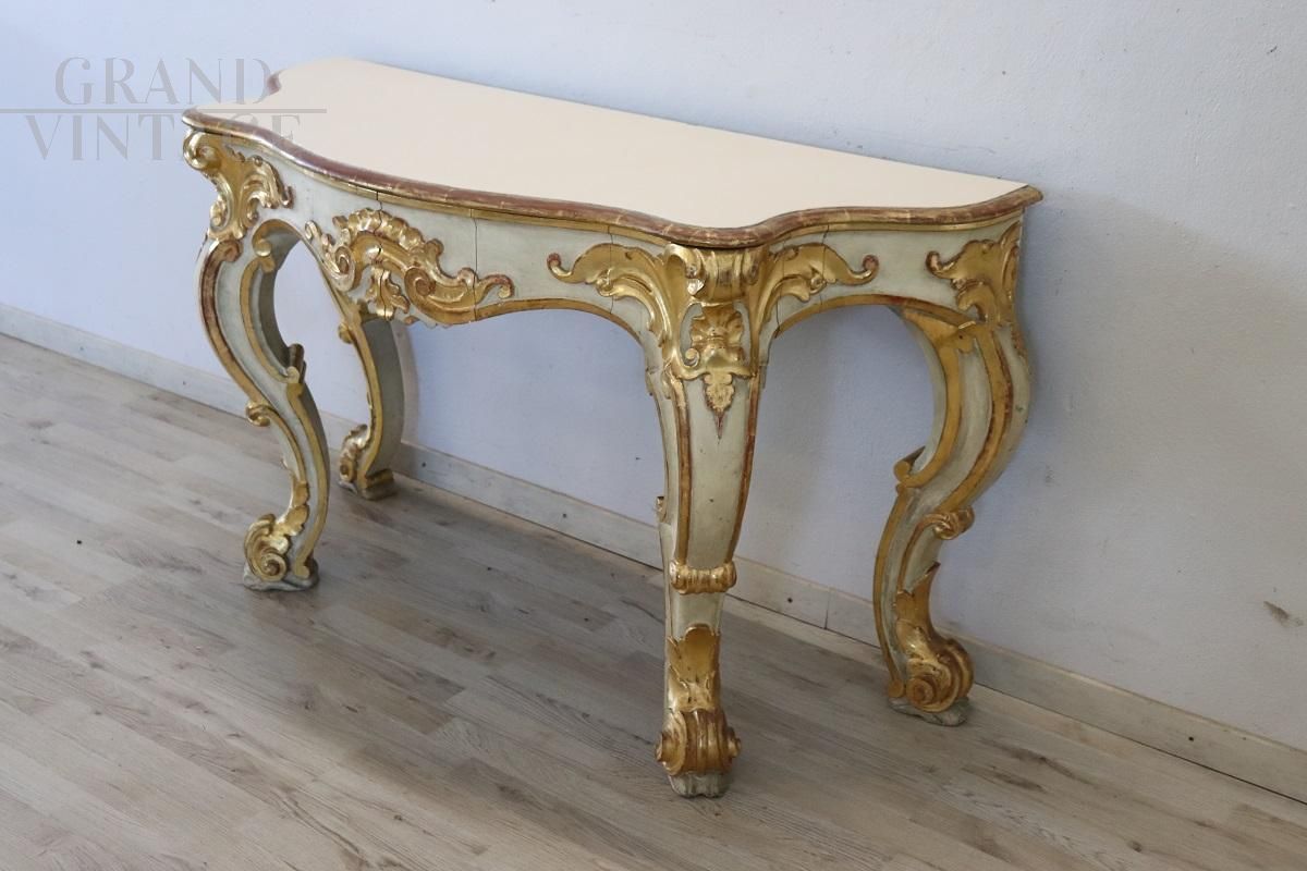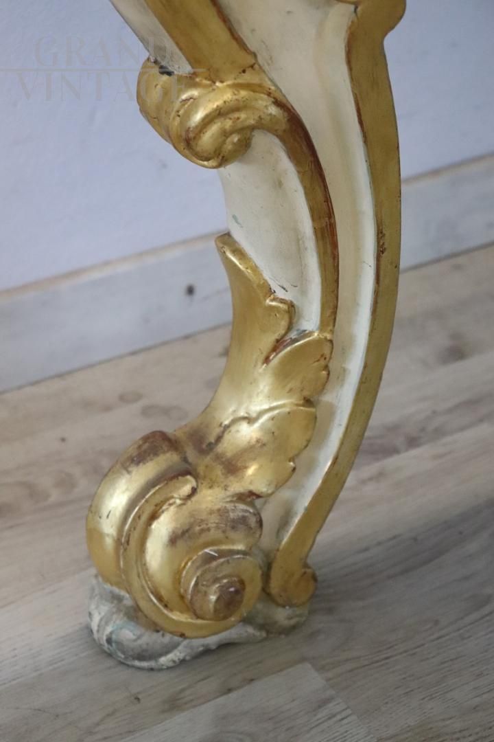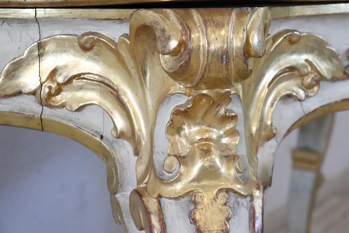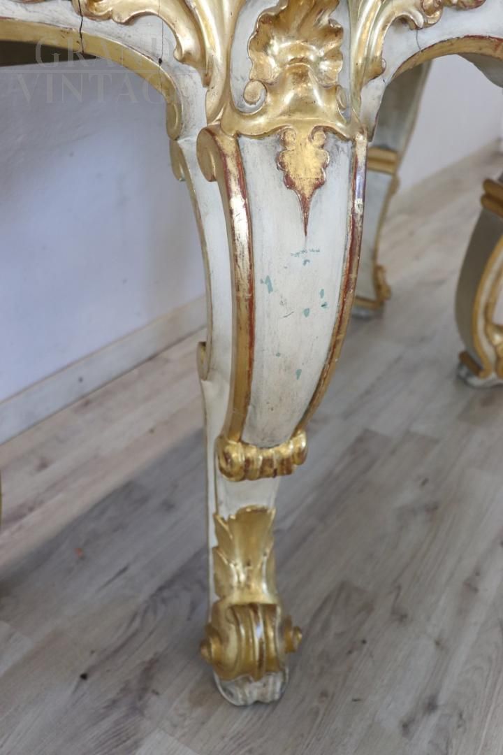 Beautiful 20th century console with a design that recalls the Baroque era, characterized by rich decorations and intricate workmanship. Made of wood, the console is decorated with relief carvings of acanthus leaves, shells and curls. The base is lacquered while the decorations are gilded with gold leaf, indicating fine workmanship. It presents the natural signs of aging, particularly evident in some parts of the lacquering and gilding, but the console top has recently been restored with a new lacquering, improving its overall aesthetic appearance. The console is versatile, ideal for decorating an entrance or a room and can be combined with a painting or a mirror for a touch of classic elegance. Price negotiable.