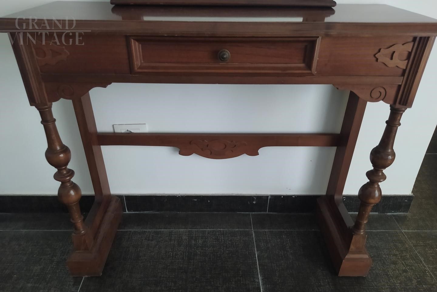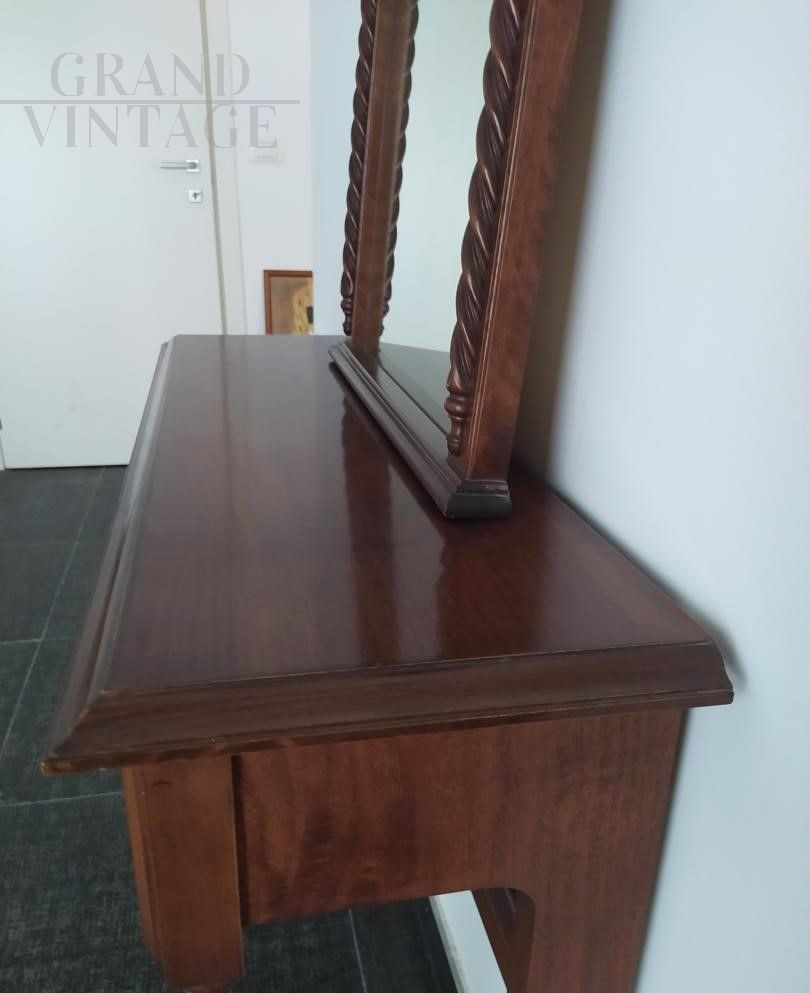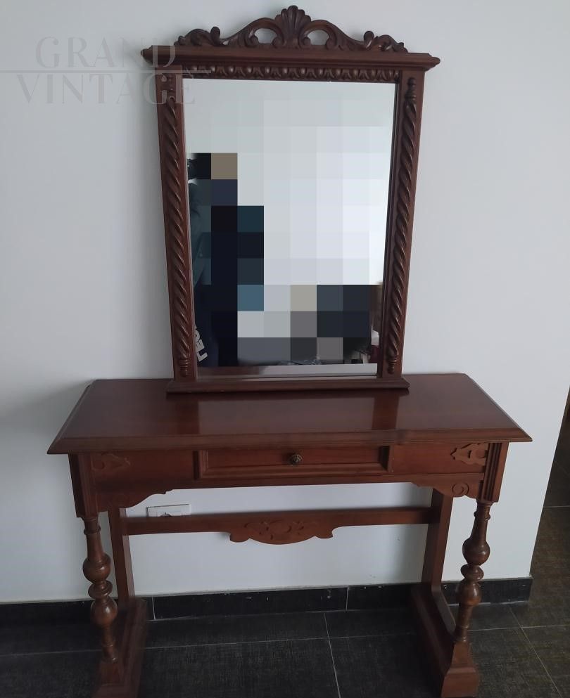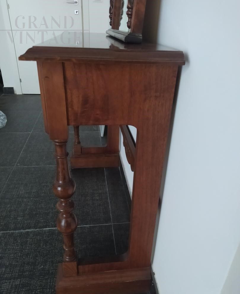 Hall console with mirror in antique classic style in wood, 1970s, with opening drawer and coordinated carved mirror, excellent condition.