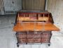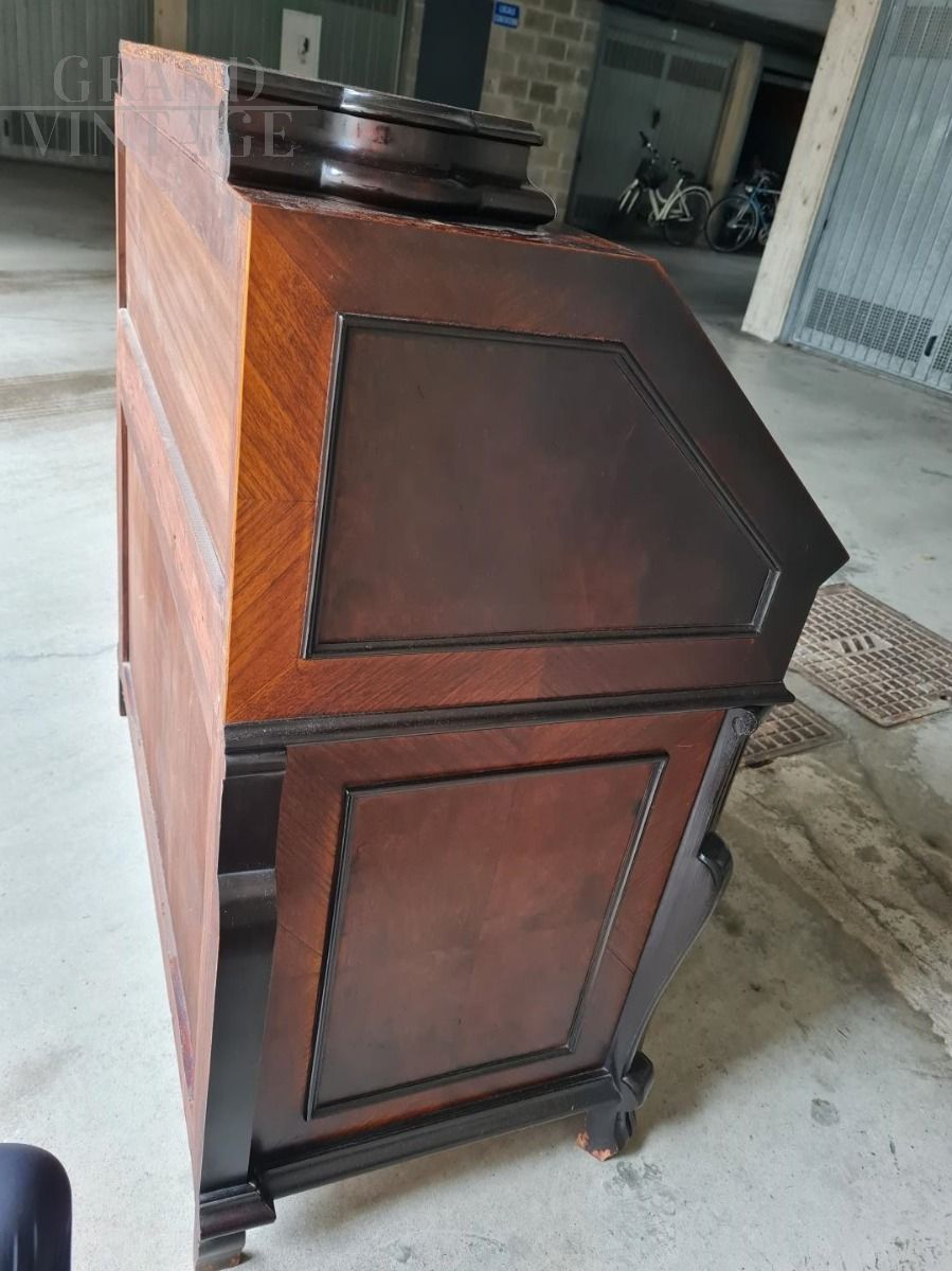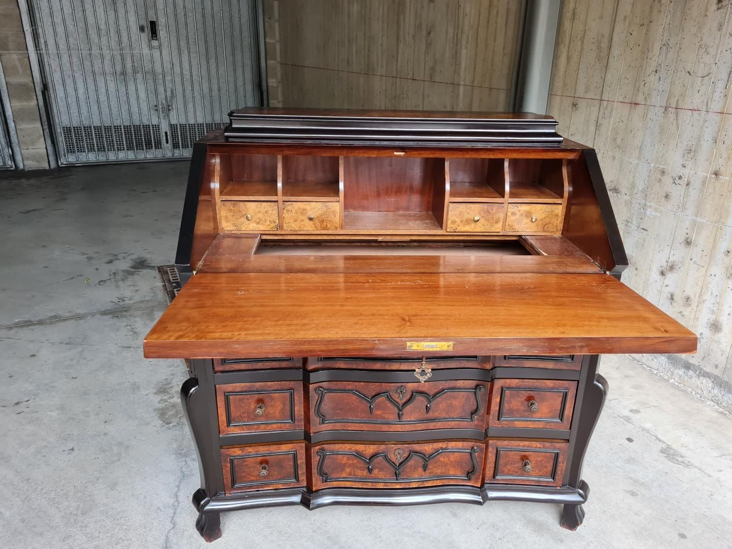 Secretaire in antique Lombard style, probably made in the 1950s, the briar front is slightly wavy with 3 large drawers. The upper part is a drop-down door in threaded wood and central medallion in walnut briar framed by ebonized decorations. The same ebonized wood decorations characterize all the drawers. The drop-down door hides compartments and small birch briar drawers. The upper top is in briar, and on the sides it has two small hidden drawers. The key is functional. The legs that create two loops at the hips are very particular. The cabinet is in original condition, it has the natural signs of aging, in particular it needs some intervention to restore the beauty of the briar on the upper top.