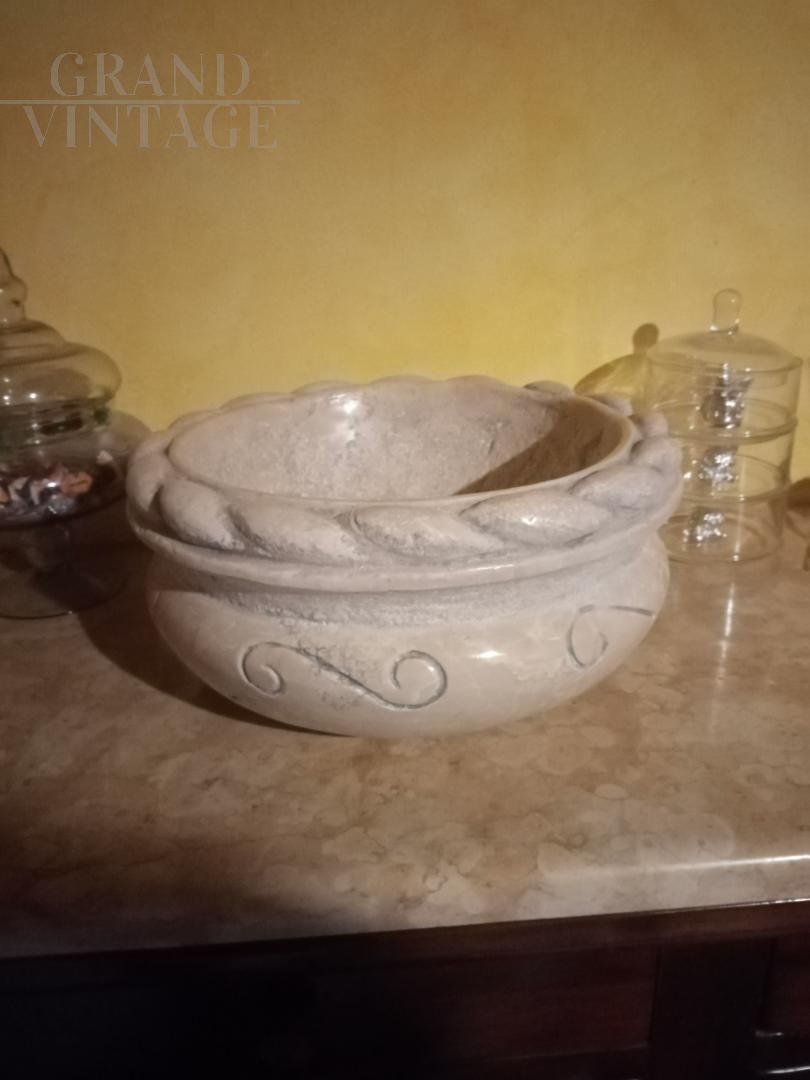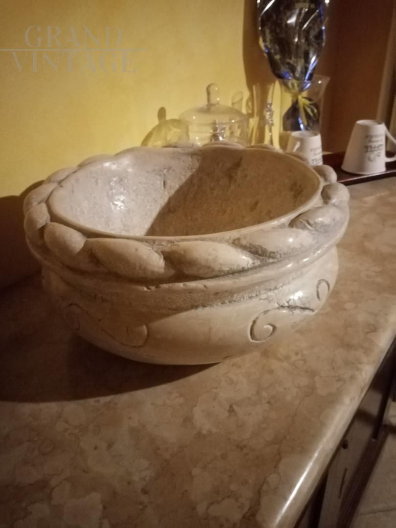 Antique style white marble bowl, which can also be used as a small stoup, handcrafted and decorated in recent times following ancient marble processing techniques.