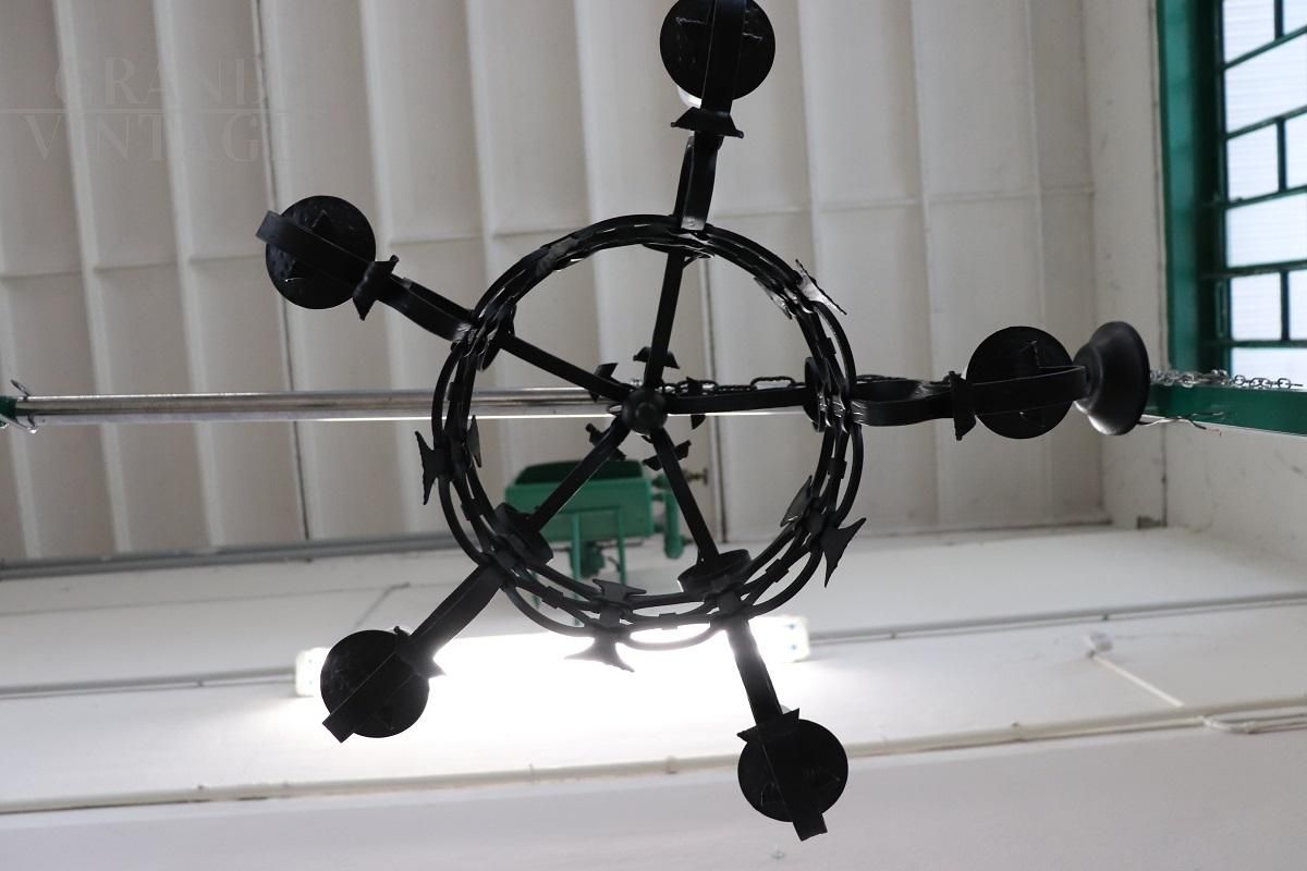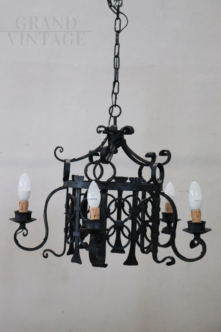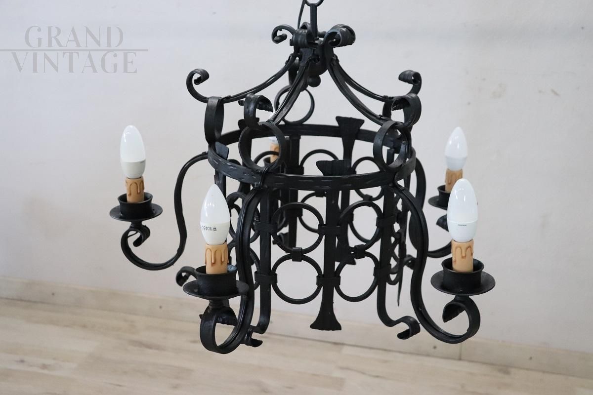 Particular black iron chandelier from the first half of the 20th century, a fascinating piece that combines elegance and functionality. The rich workmanship with curls and swirls gives a sophisticated touch, perfect for those who want to add a touch of class to their home. Thanks to its five arms with respective bulbs, it not only illuminates the space effectively, but also serves as a decorative element that captures attention. Ideal for different locations, such as entrances or corridors, where it can be admired in all its beauty. The chandelier has been rewired with a new electrical system and is ready to be installed in the home. Price negotiable.