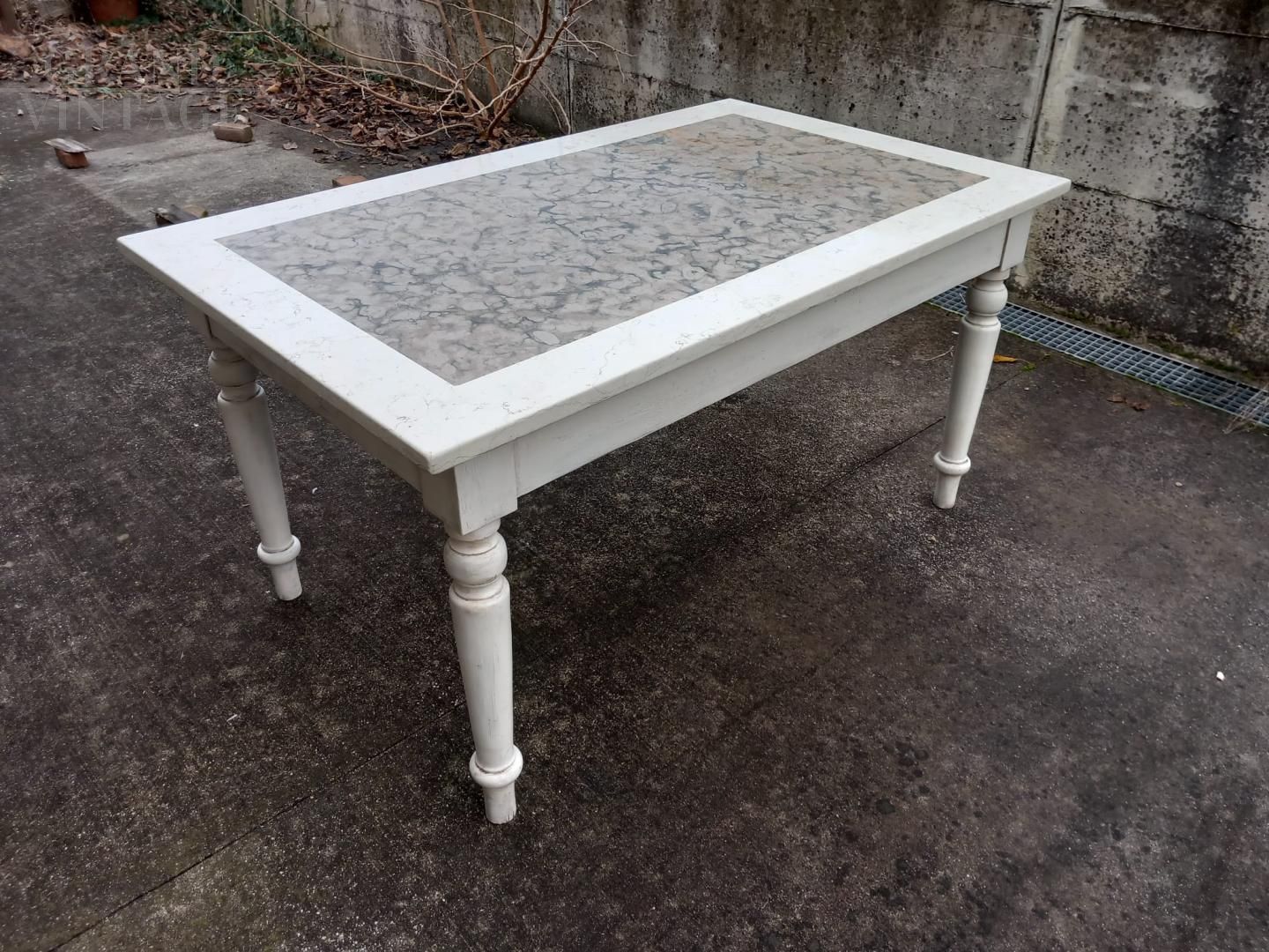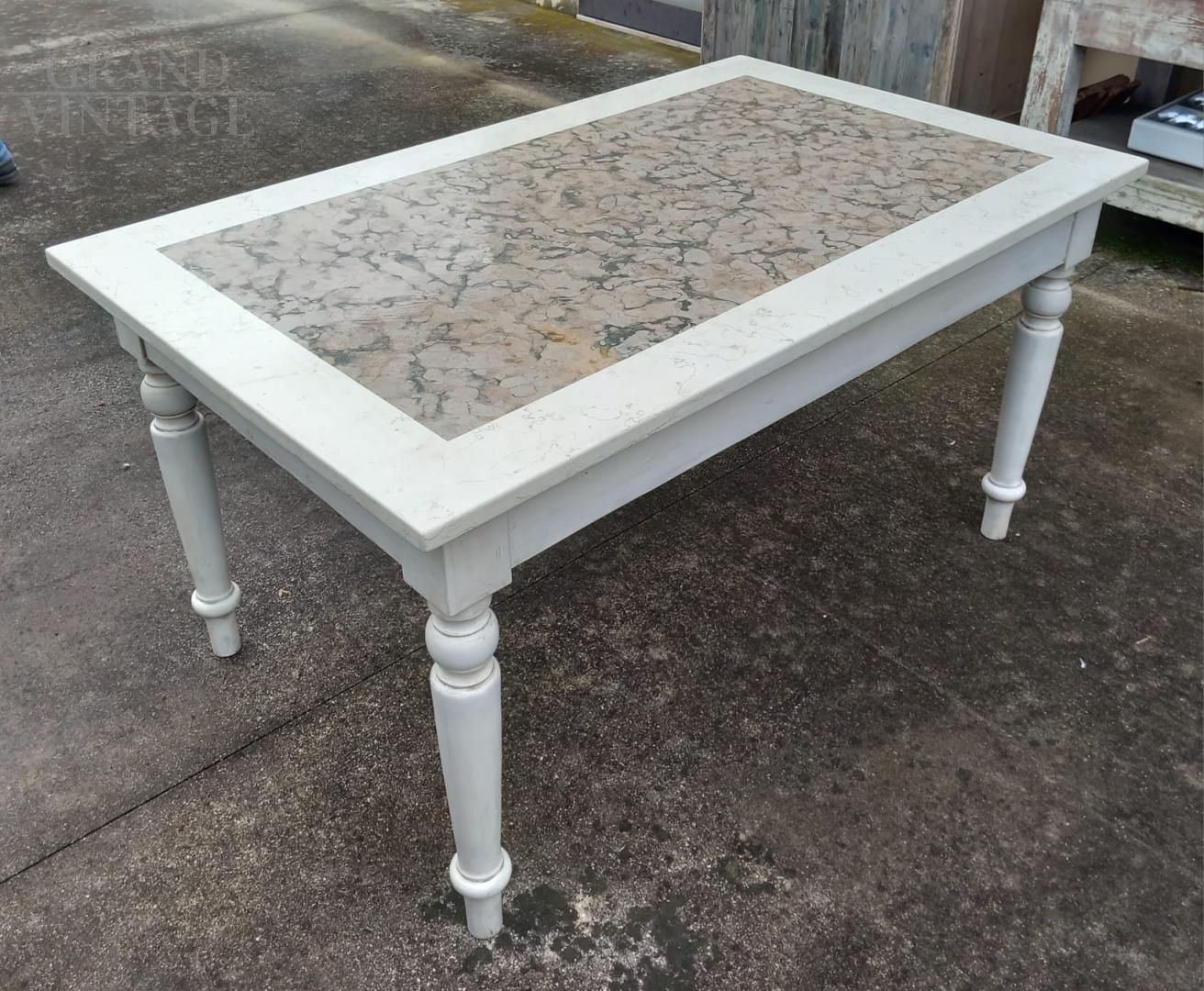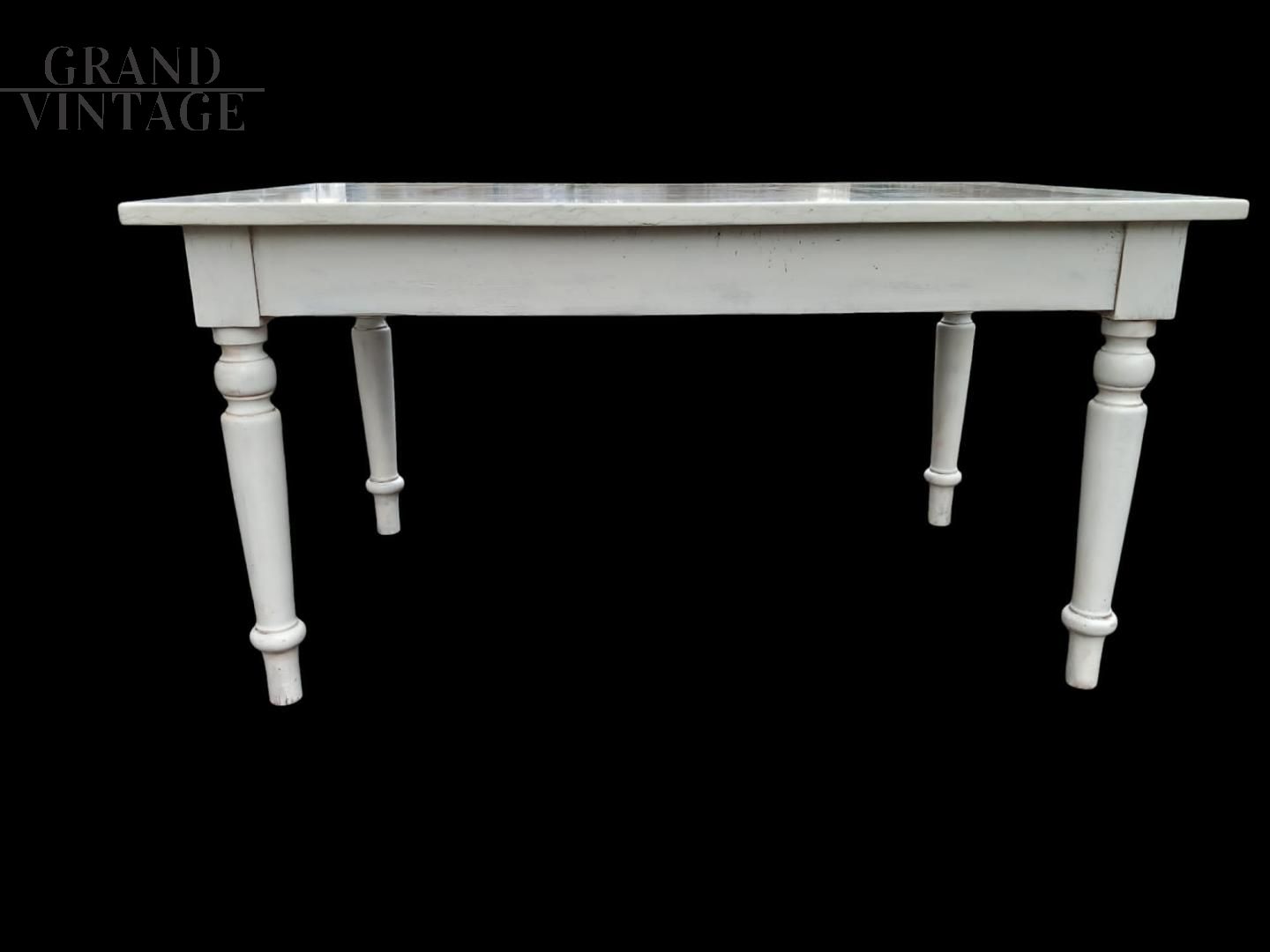 19th century table with marble top with a special white band. The legs and band are in white lacquered wood. The height from the ground to the band under the top is 65 cm, an excellent space for the legs that makes this table suitable for modern chairs too. Excellent size, especially in depth (96 cm).