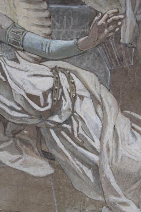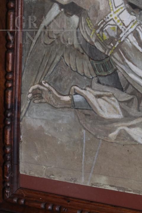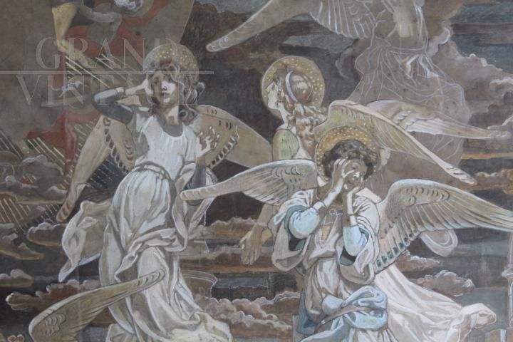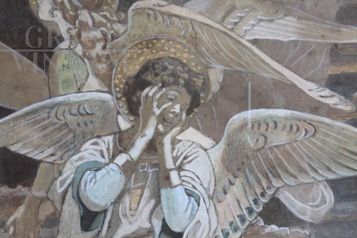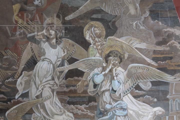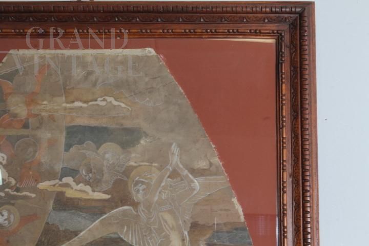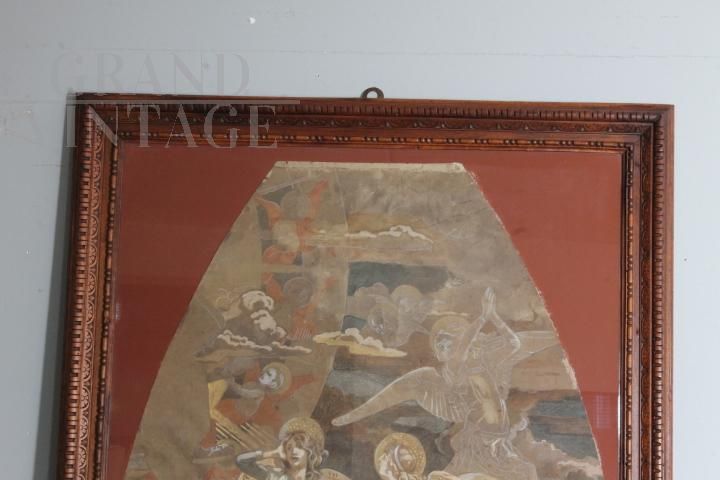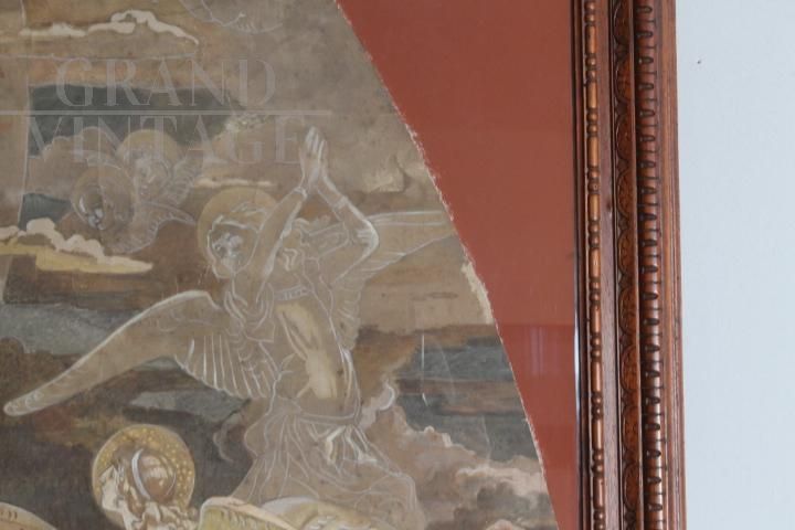 Antique tempera painting depicting angels, sketch for a 19th century fresco