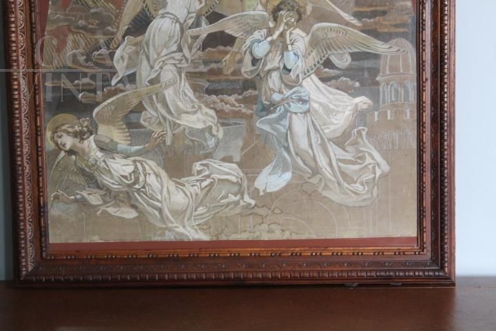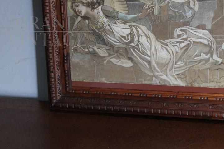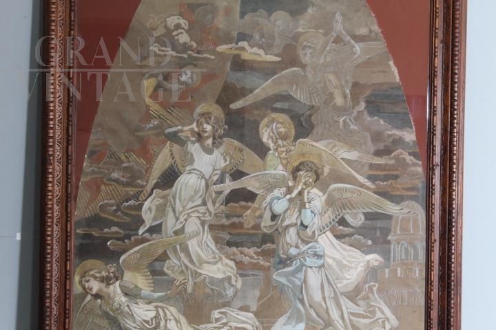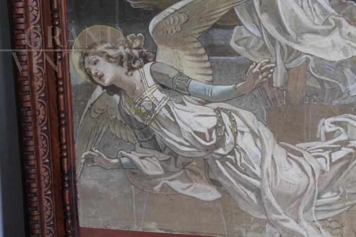 Antique tempera painting depicting angels with architecture in the background, it is a preparatory sketch for a fresco from the late 19th century, of great quality, in an anticated carved walnut frame.