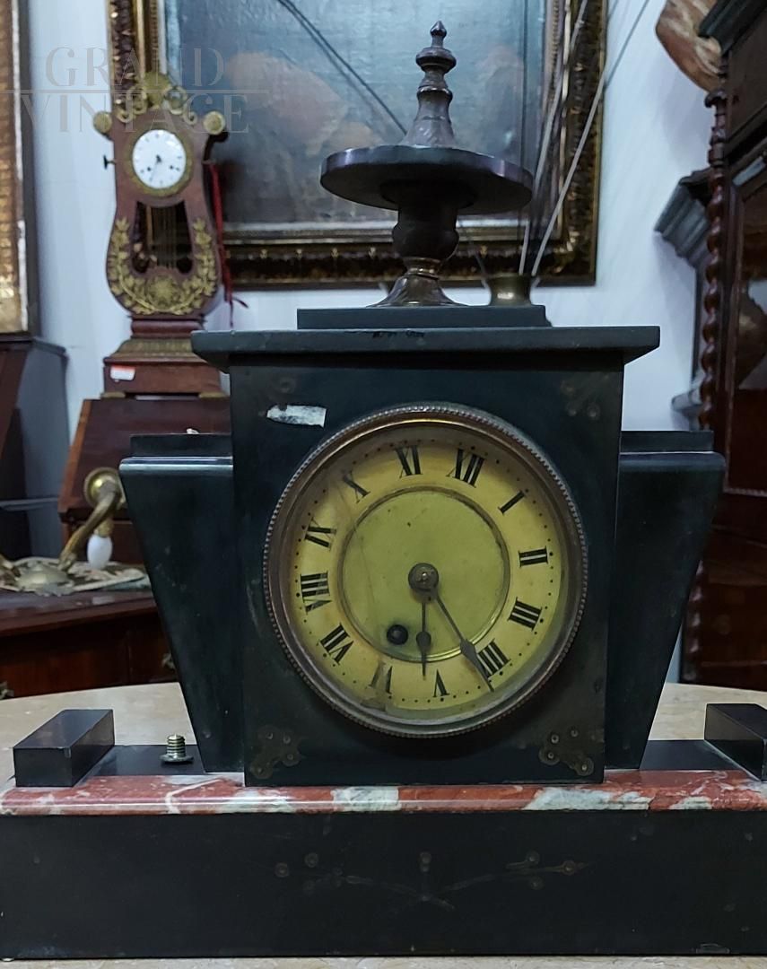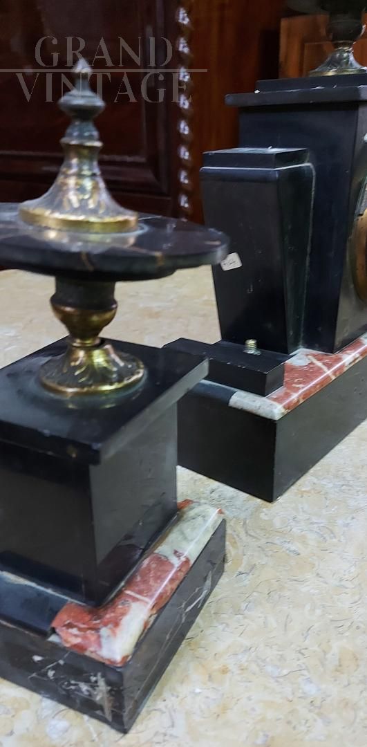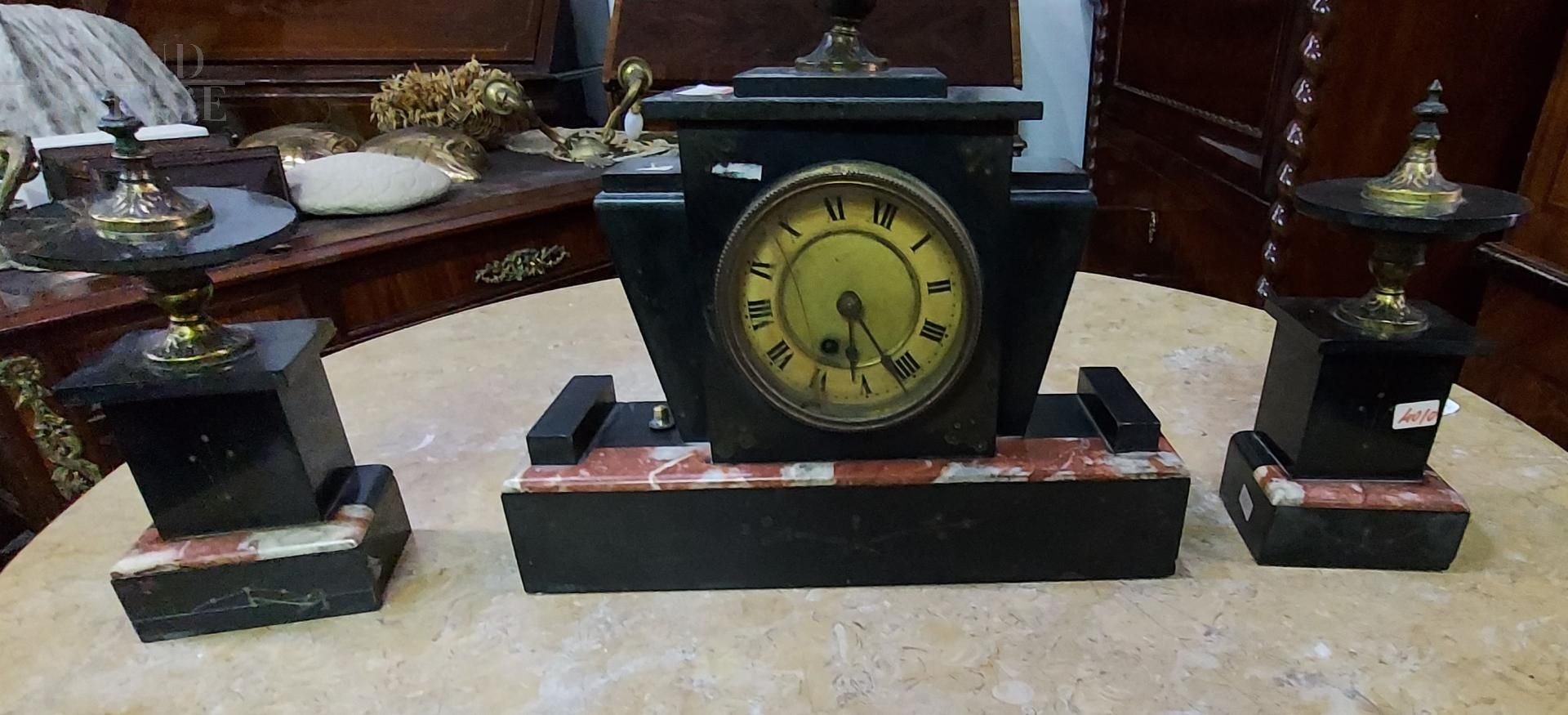 Antique triptych with mantel clock in black statuary marble and red France marble, bronze finishes, late 19th century, shows some signs of wear.