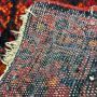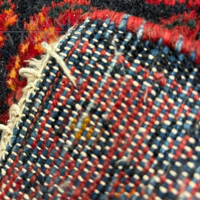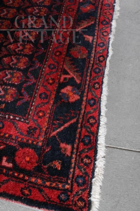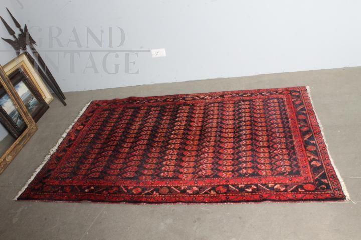 Vintage Turkish - Persian Hamadan carpet from the 1950s with red background and herringbone pattern in shades of blue and orange, knotted in very refined wool, in very good condition, coming from a private collection.