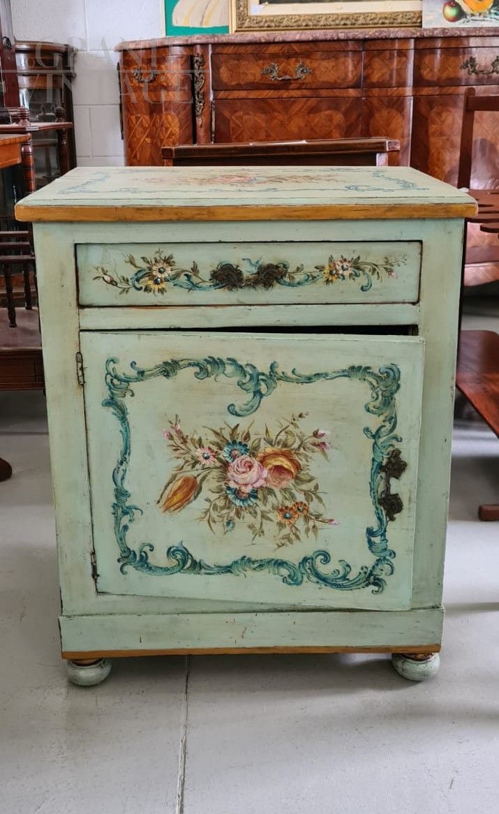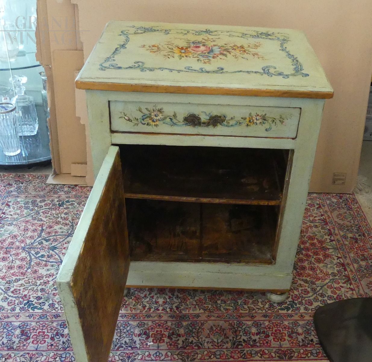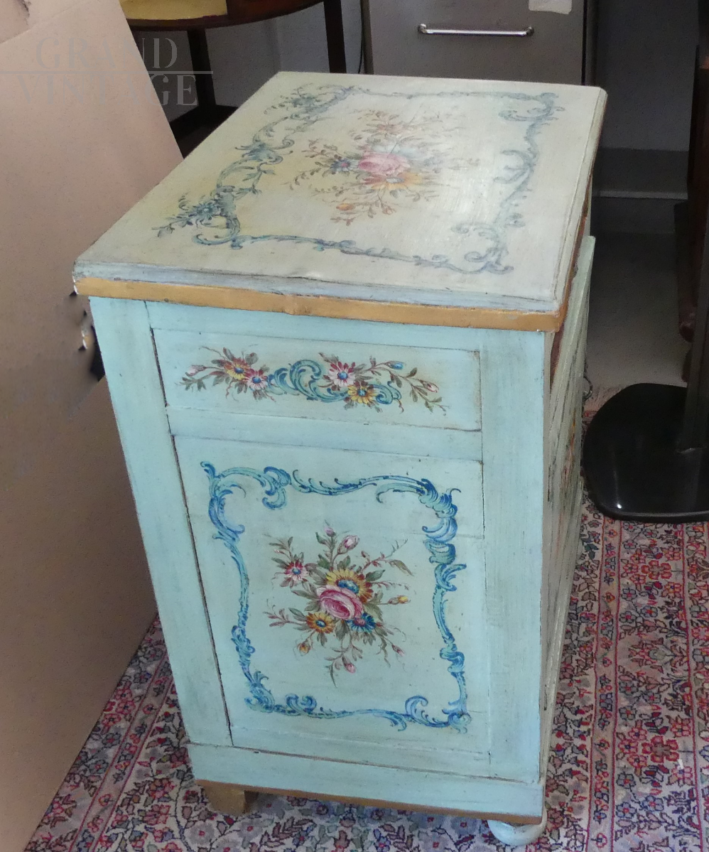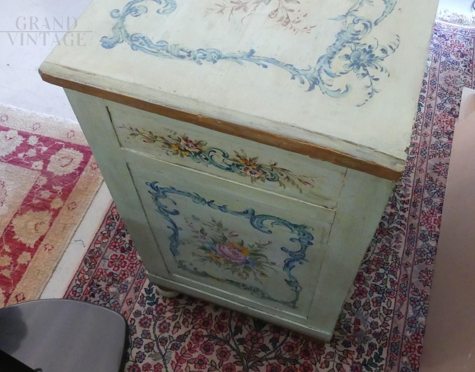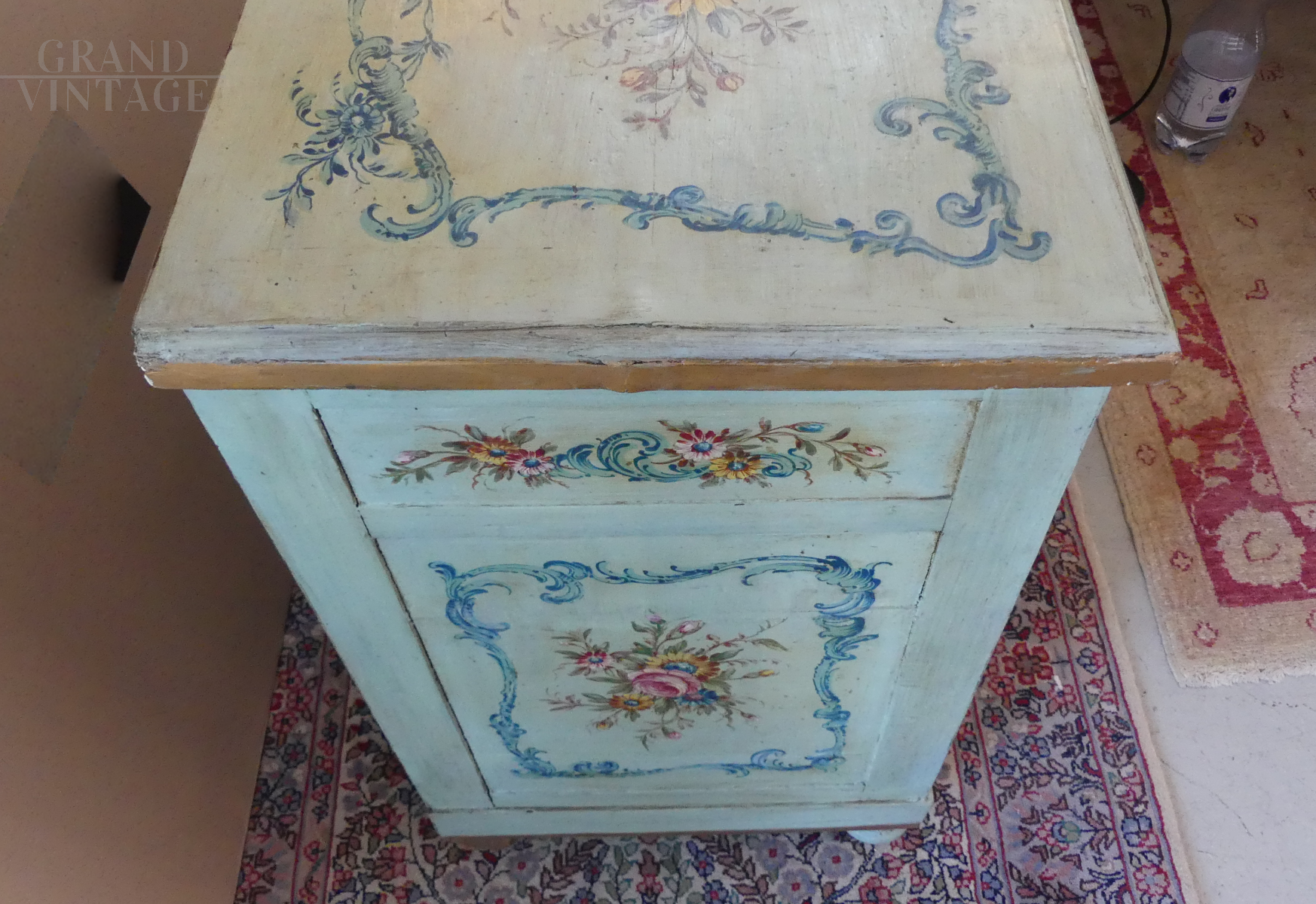 Antique Venetian bedside cabinet in soft fir and walnut wood, lacquered in a very light green color and hand painted with wonderful floral decorations on the top, front and sides.