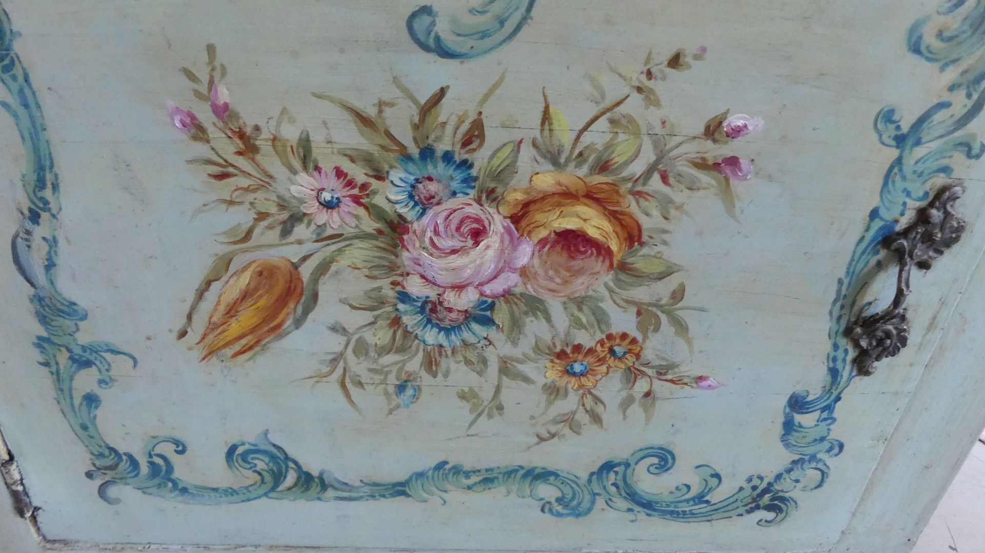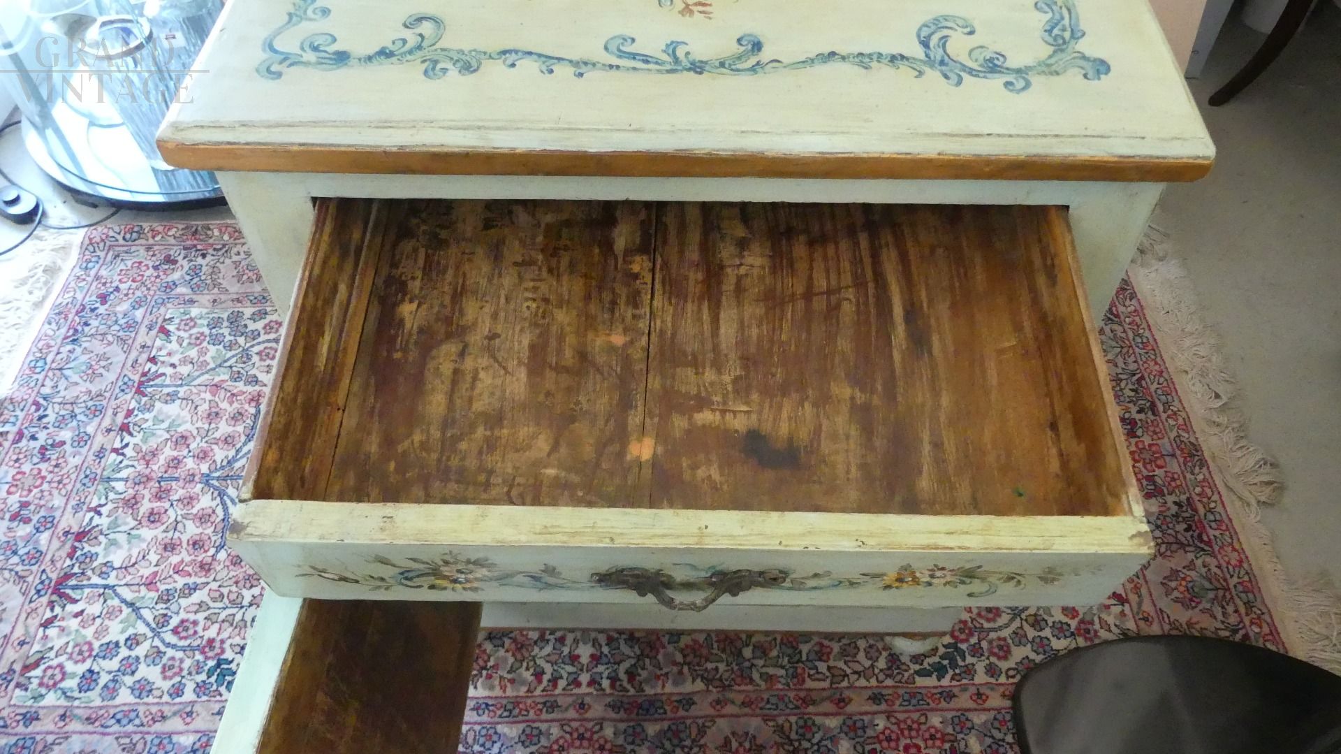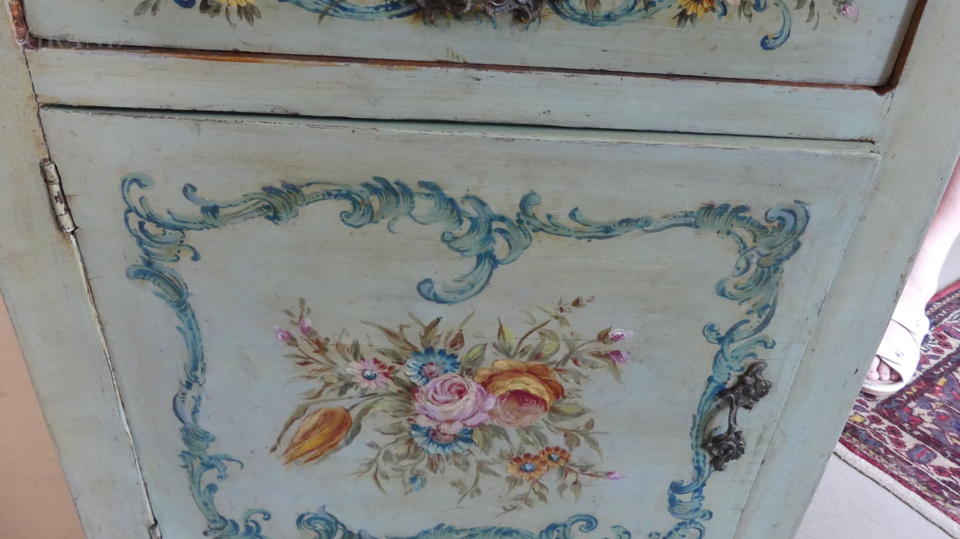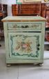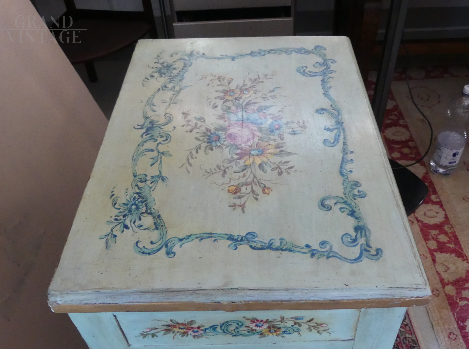 Antique Venetian bedside cabinet in soft fir and walnut wood, lacquered in a very light green color and hand painted with wonderful floral decorations on the top, front and sides.